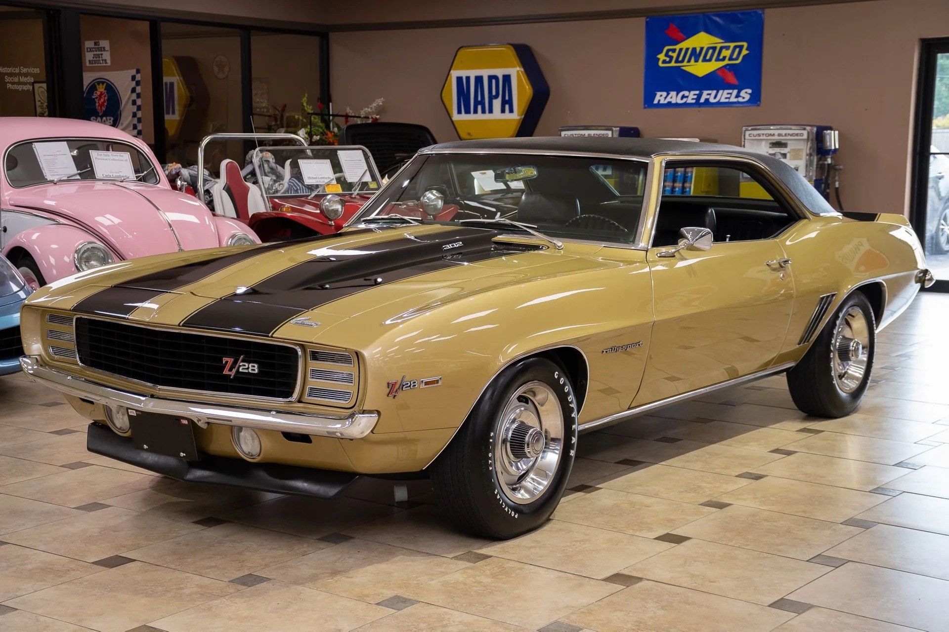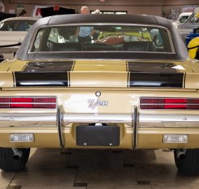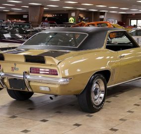 Offering an X33 Z/28 Camaro featuring a powerful V8 engine, Muncie M21 close-ratio 4-speed transmission, and 4.10 posi 12-bolt rear axle. It includes the Rally Sport package, power steering and brakes, Chevy rally wheels with Goodyear Polyglas tires, ZL2 ducted hood, center console with gauges, and black vinyl interior with bucket seats. Finished in correct Olympic Gold with black stripes and "Halo" black vinyl top. Contact us for details!