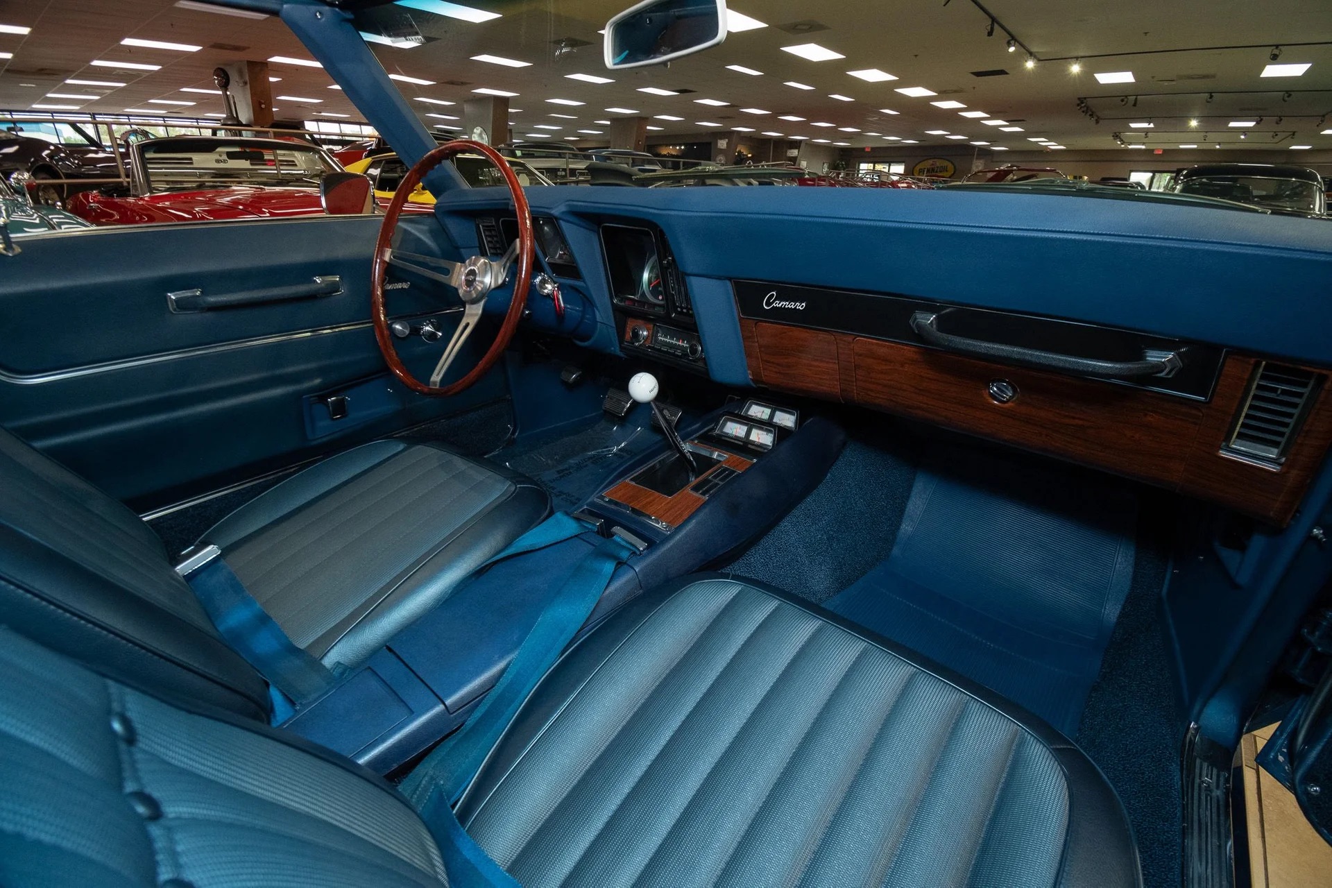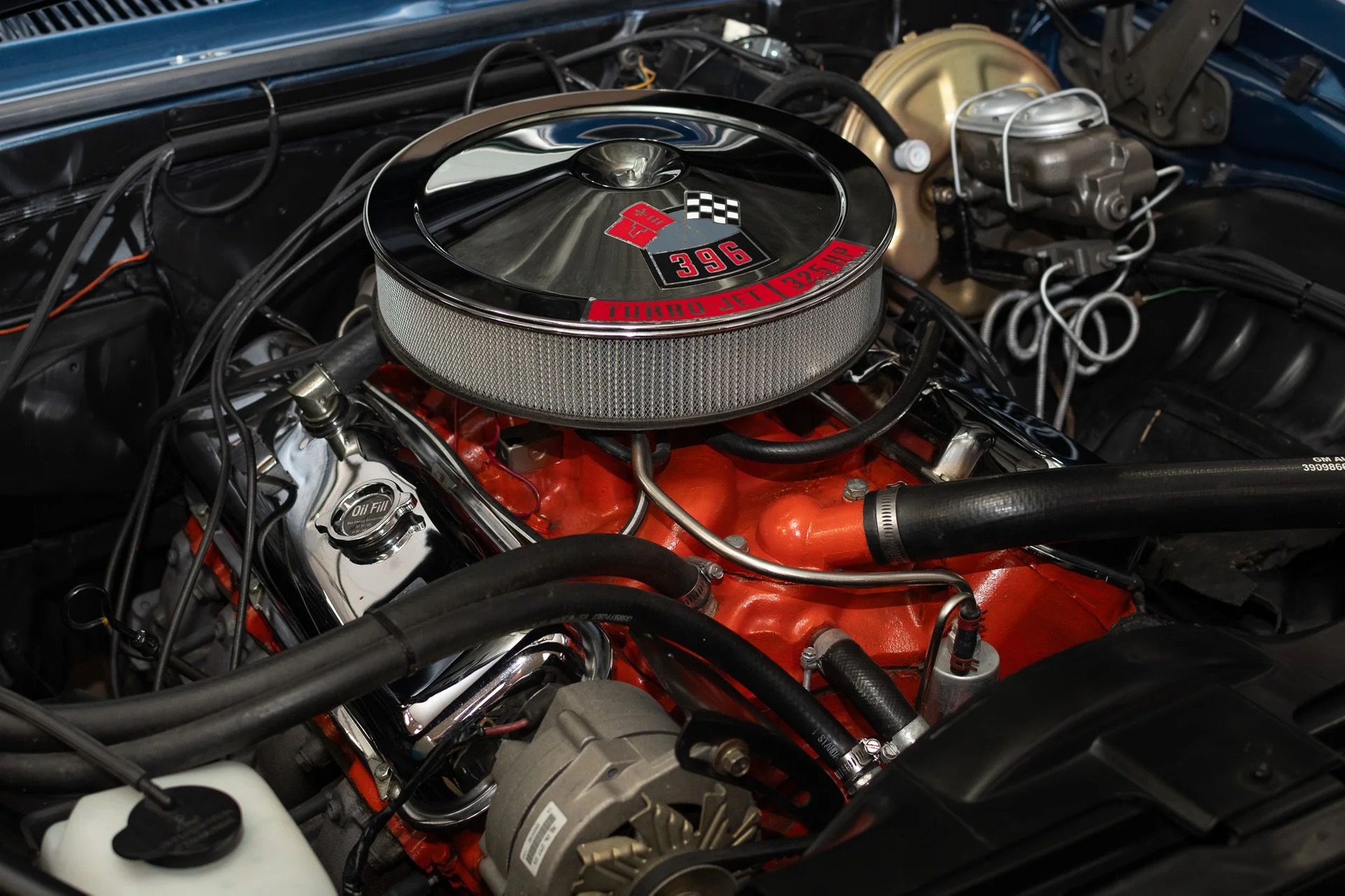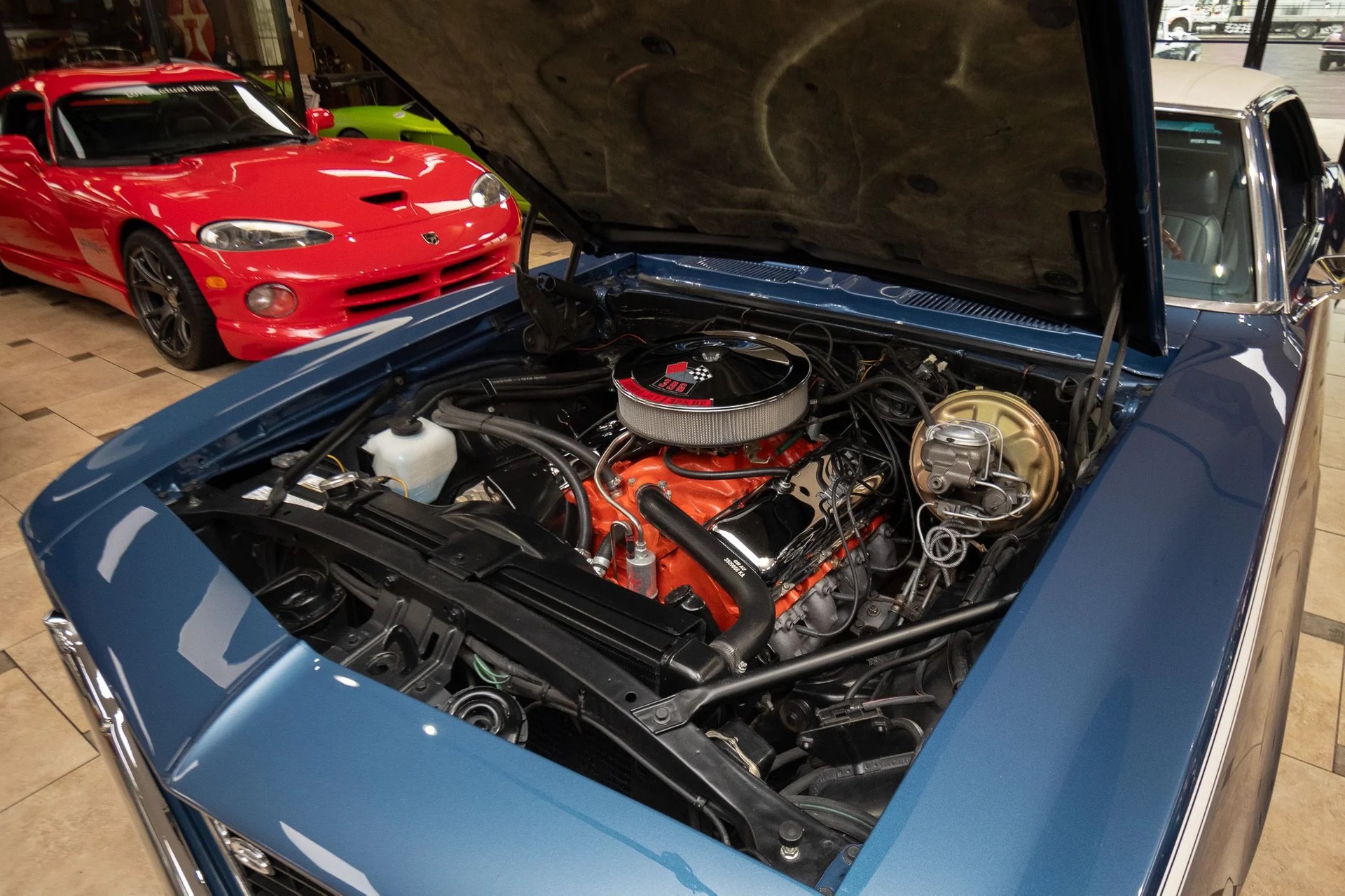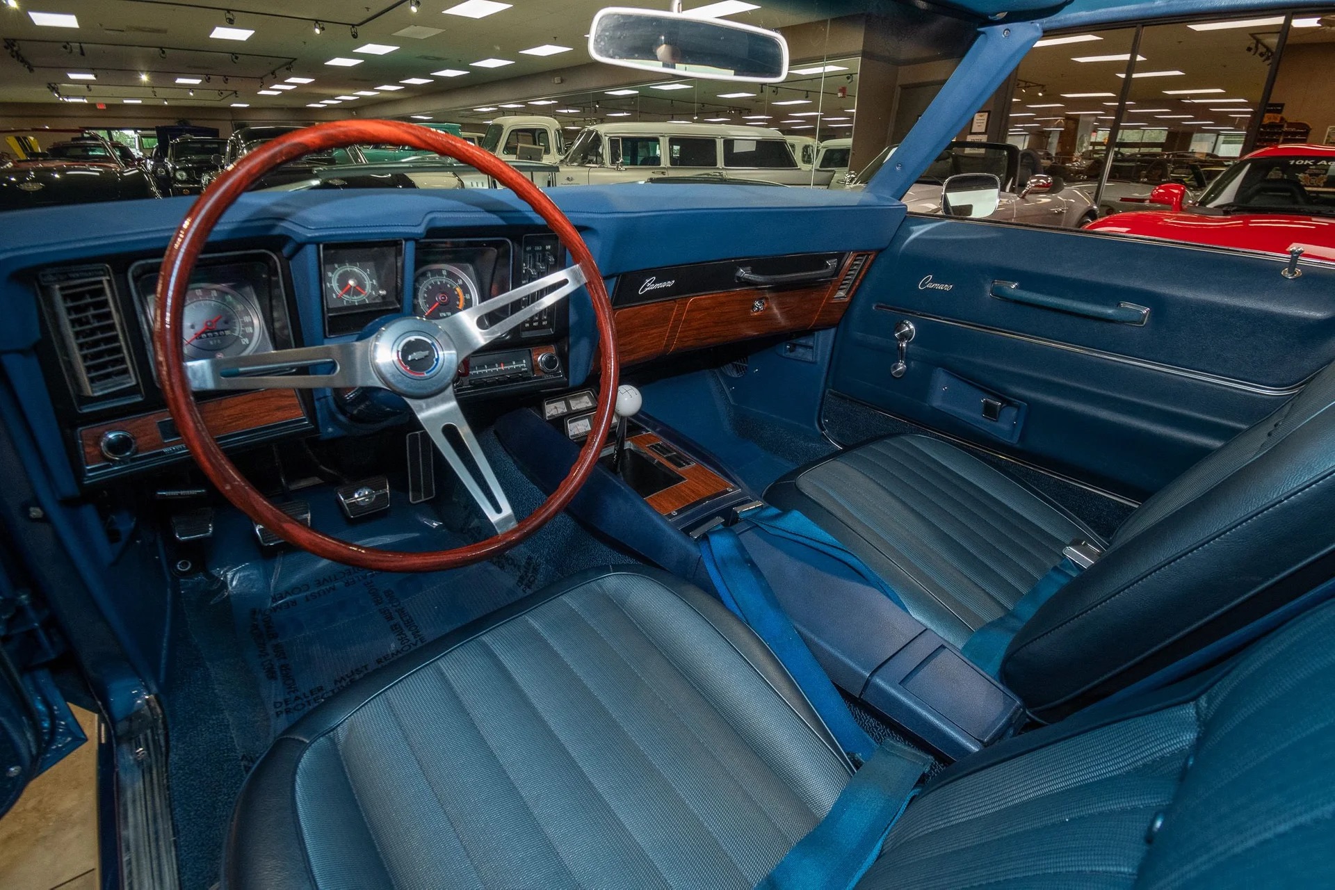 X22 Code Super Sport featuring a powerful Big Block 396 C.I. V8 with a correct Muncie M20 4-speed manual transmission. It includes power steering and brakes, front disc brakes, RS hideaway headlights, and Magnum 500-style wheels. The car boasts a blue custom interior with bucket seats, rosewood steering wheel, and center console with auxiliary gauges. Contact us today for details!