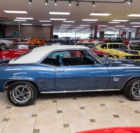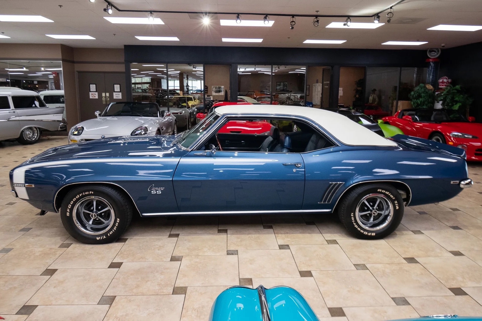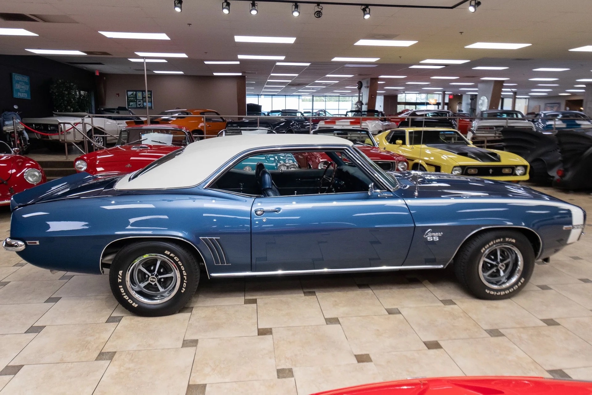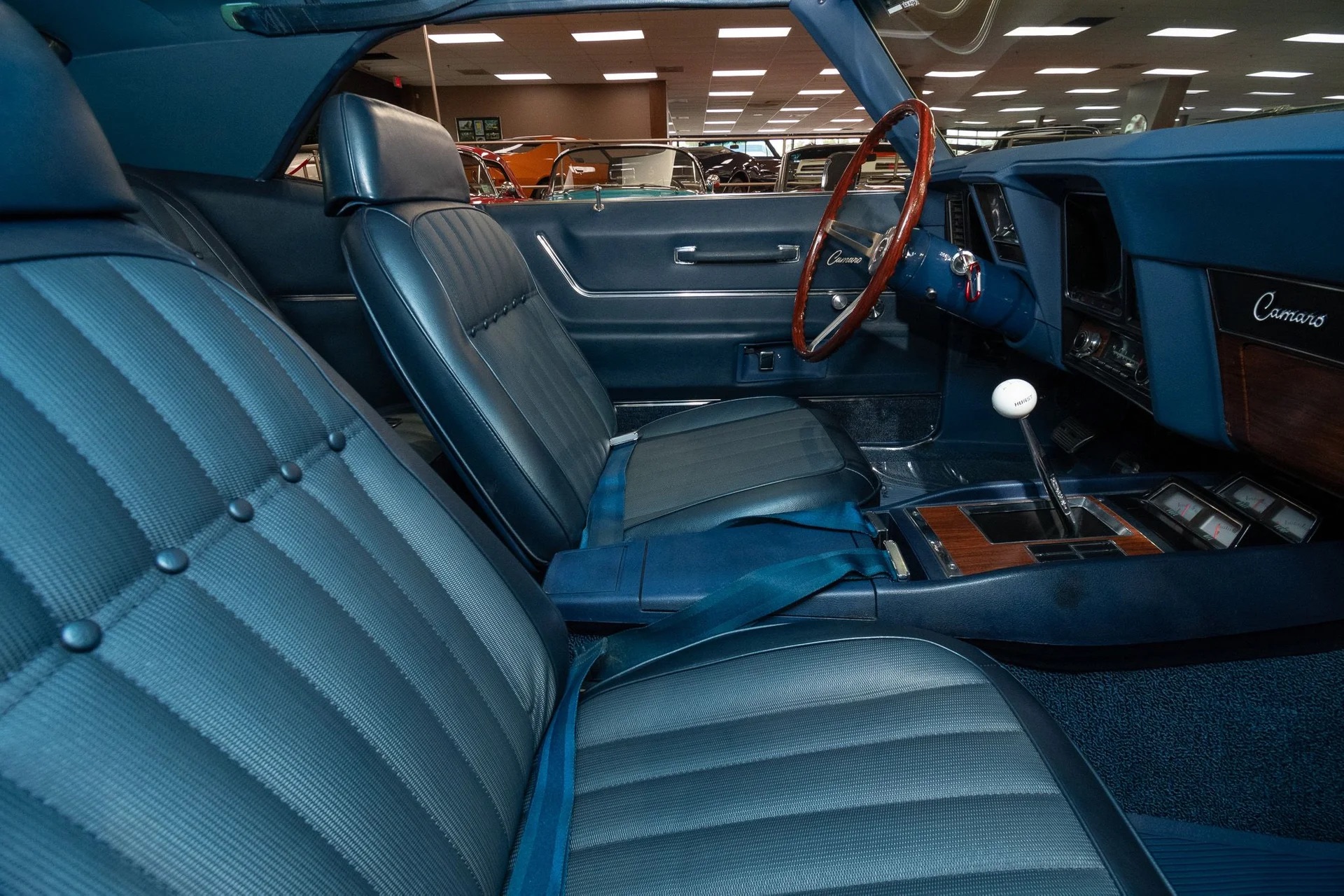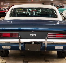 X22 Code Super Sport featuring a powerful Big Block 396 C.I. V8 with a correct Muncie M20 4-speed manual transmission. It includes power steering and brakes, front disc brakes, RS hideaway headlights, and Magnum 500-style wheels. The car boasts a blue custom interior with bucket seats, rosewood steering wheel, and center console with auxiliary gauges. Contact us today for details!