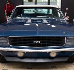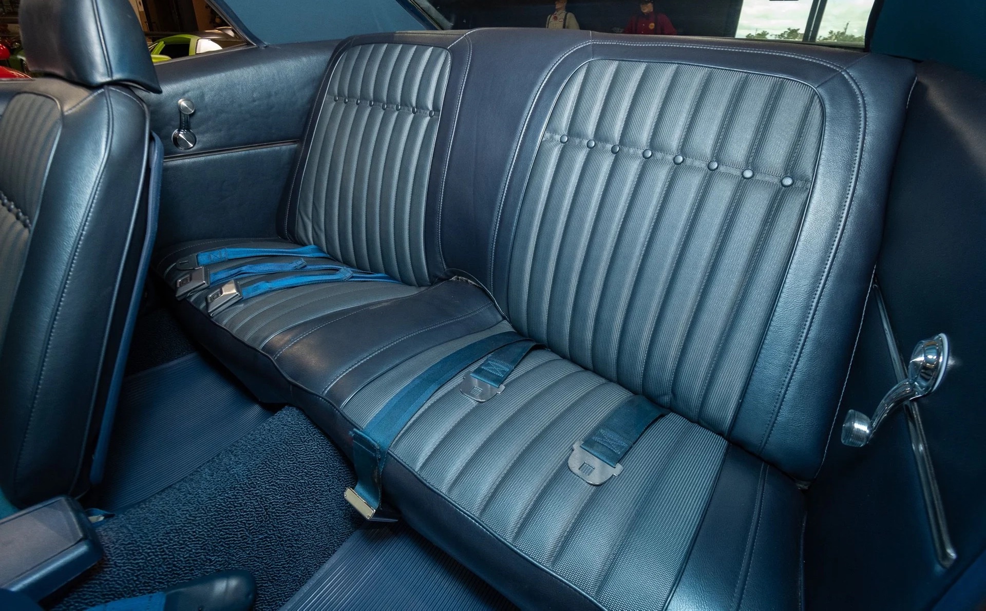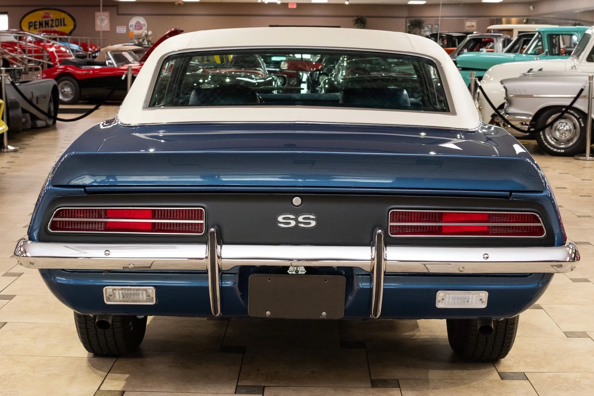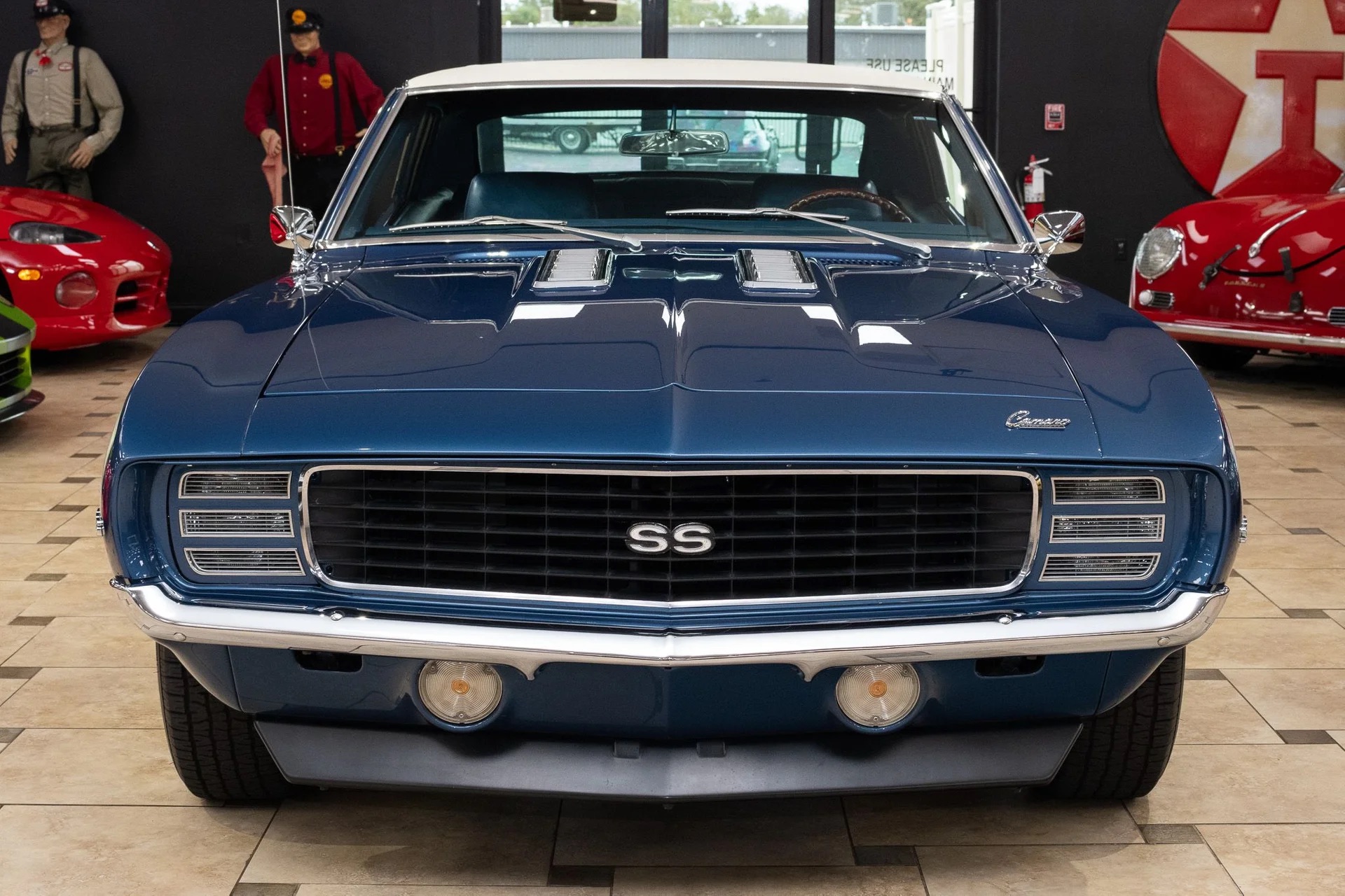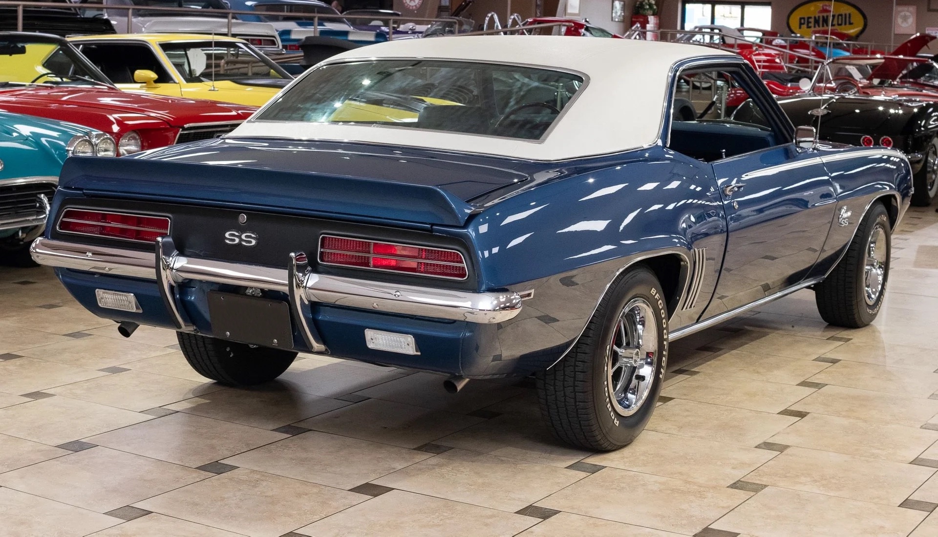 X22 Code Super Sport featuring a powerful Big Block 396 C.I. V8 with a correct Muncie M20 4-speed manual transmission. It includes power steering and brakes, front disc brakes, RS hideaway headlights, and Magnum 500-style wheels. The car boasts a blue custom interior with bucket seats, rosewood steering wheel, and center console with auxiliary gauges. Contact us today for details!