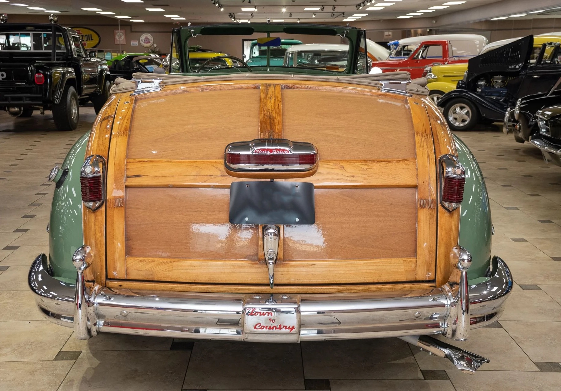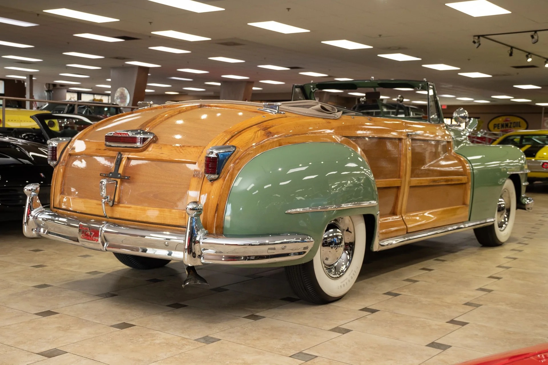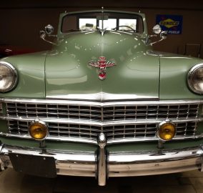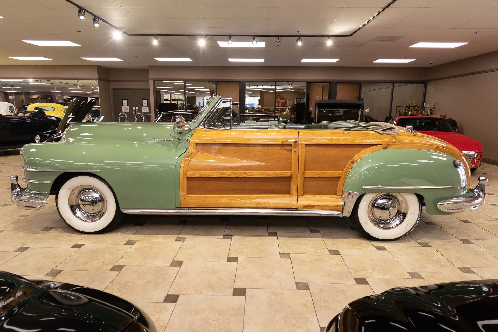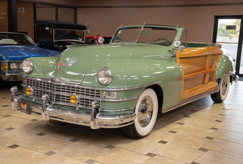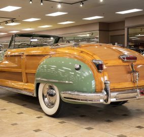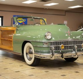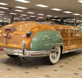 Classic beauty featuring a 323 C.I. 135hp Spitfire Straight-8 engine and 4-speed Fluid Drive transmission. Highlights include a beige power convertible top, custom wood and chrome work, dual Mopar spotlights, wide whitewall tires, and an AM radio. This timeless convertible also boasts push-button start and a carpeted trunk with spare tire. Contact us today to learn more!
