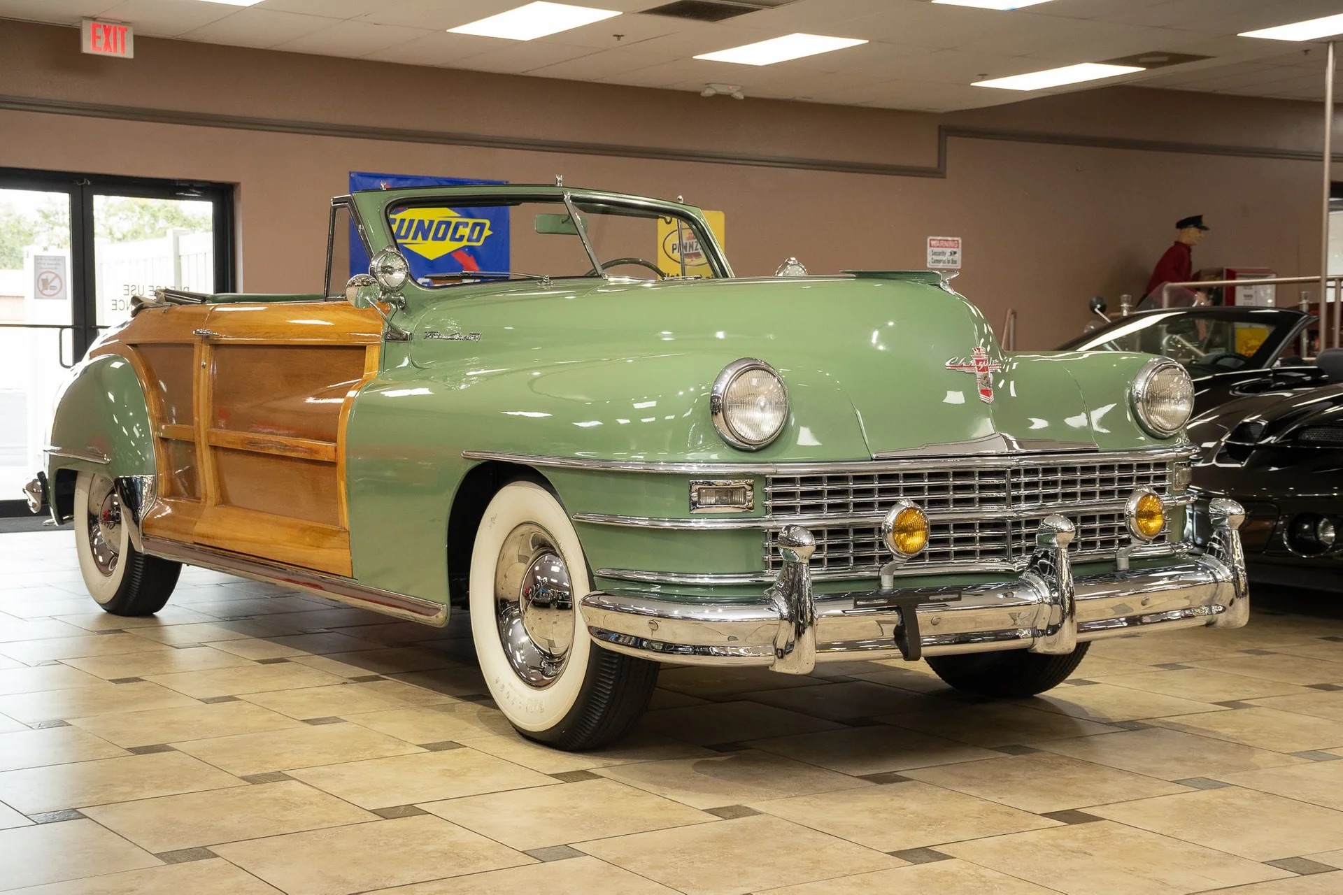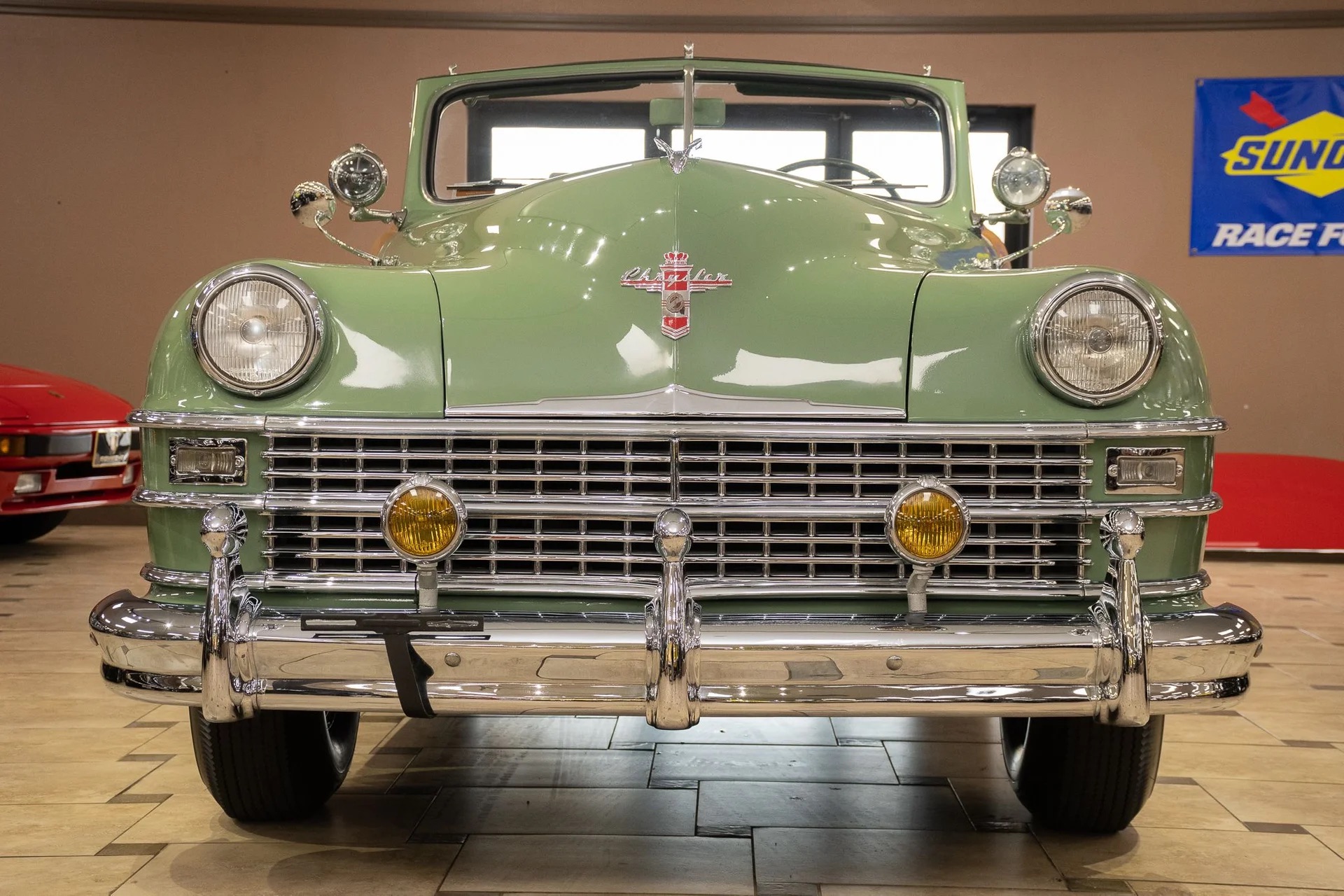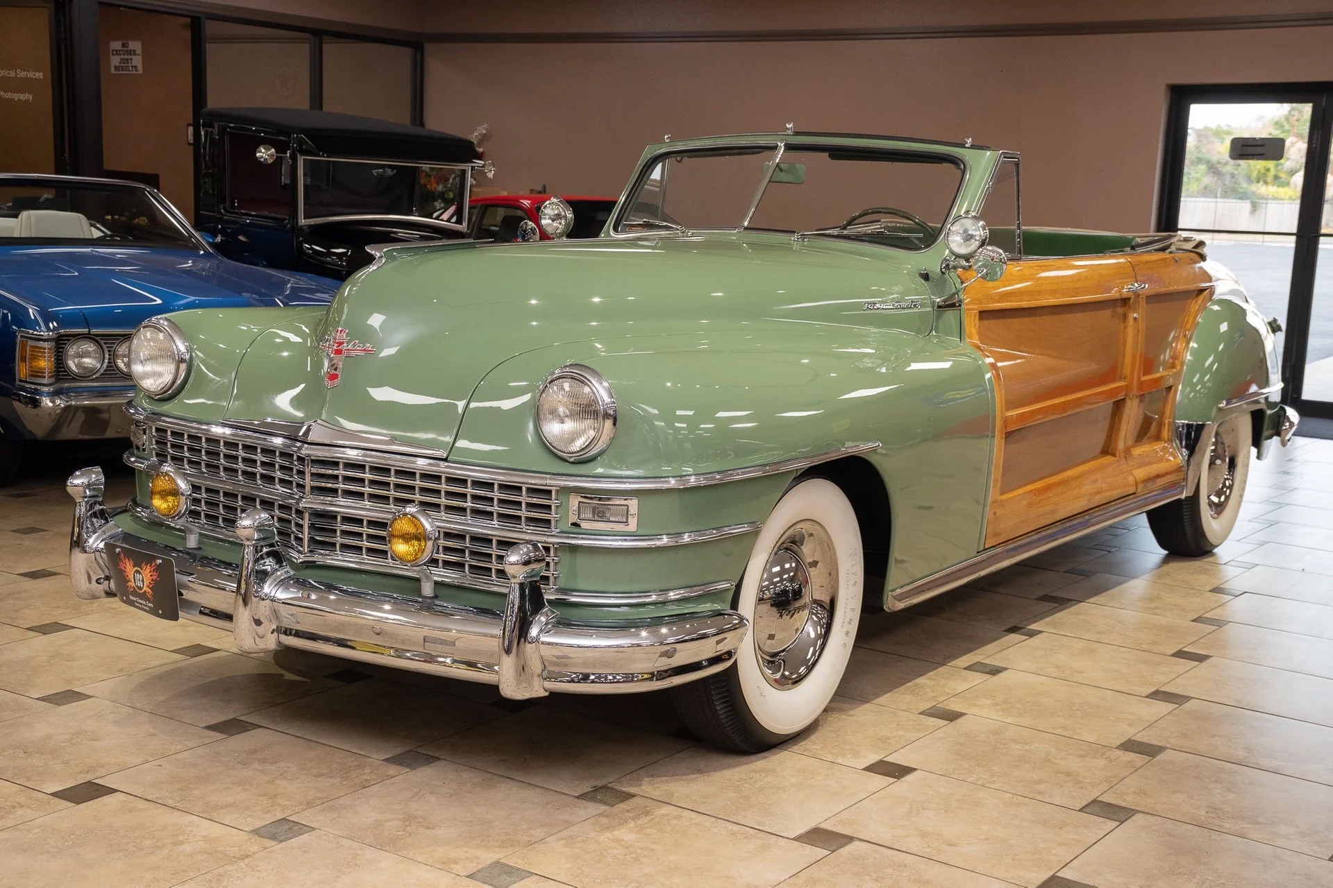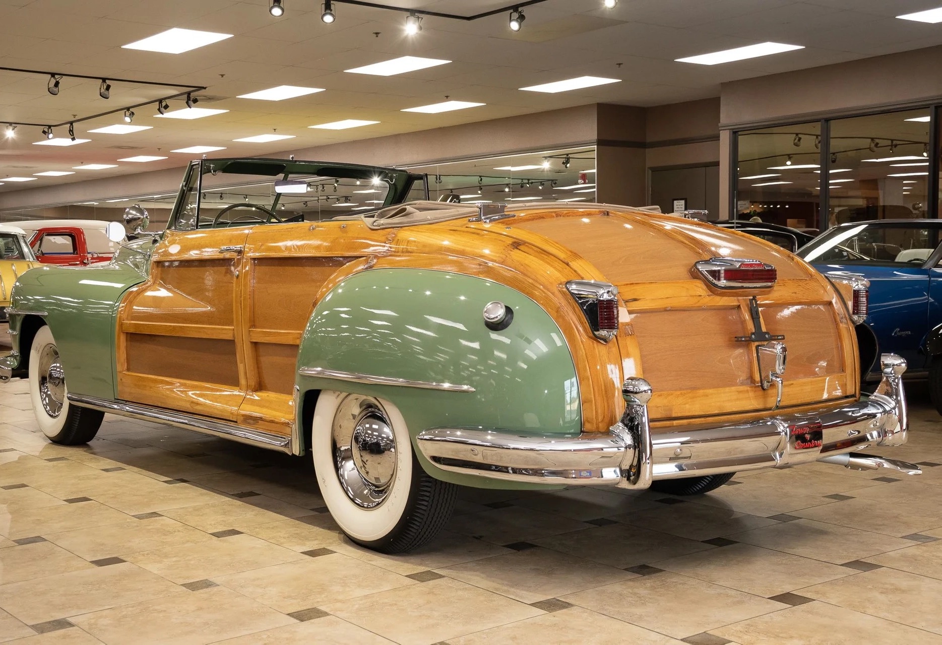 Classic beauty featuring a 323 C.I. 135hp Spitfire Straight-8 engine and 4-speed Fluid Drive transmission. Highlights include a beige power convertible top, custom wood and chrome work, dual Mopar spotlights, wide whitewall tires, and an AM radio. This timeless convertible also boasts push-button start and a carpeted trunk with spare tire. Contact us today to learn more!