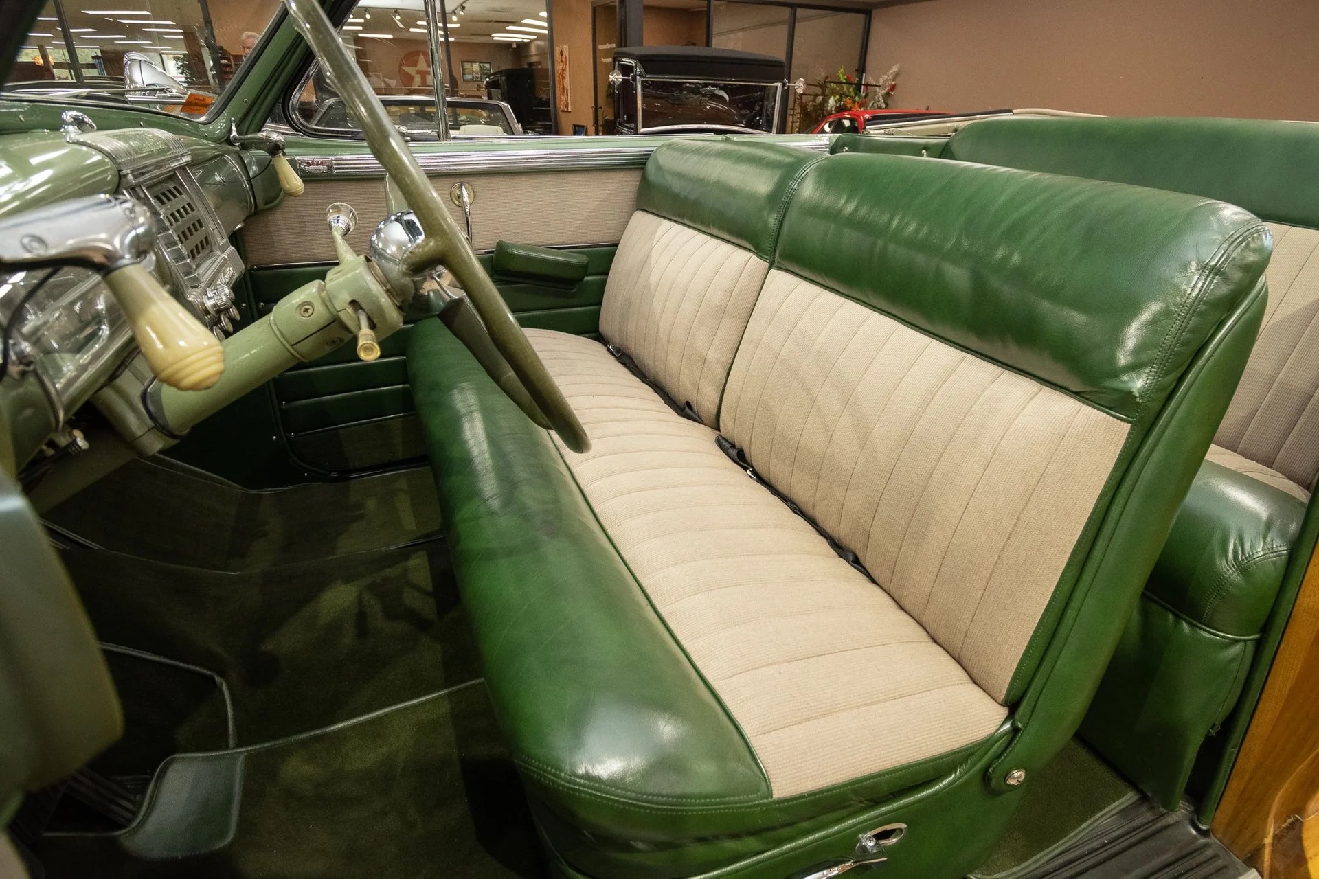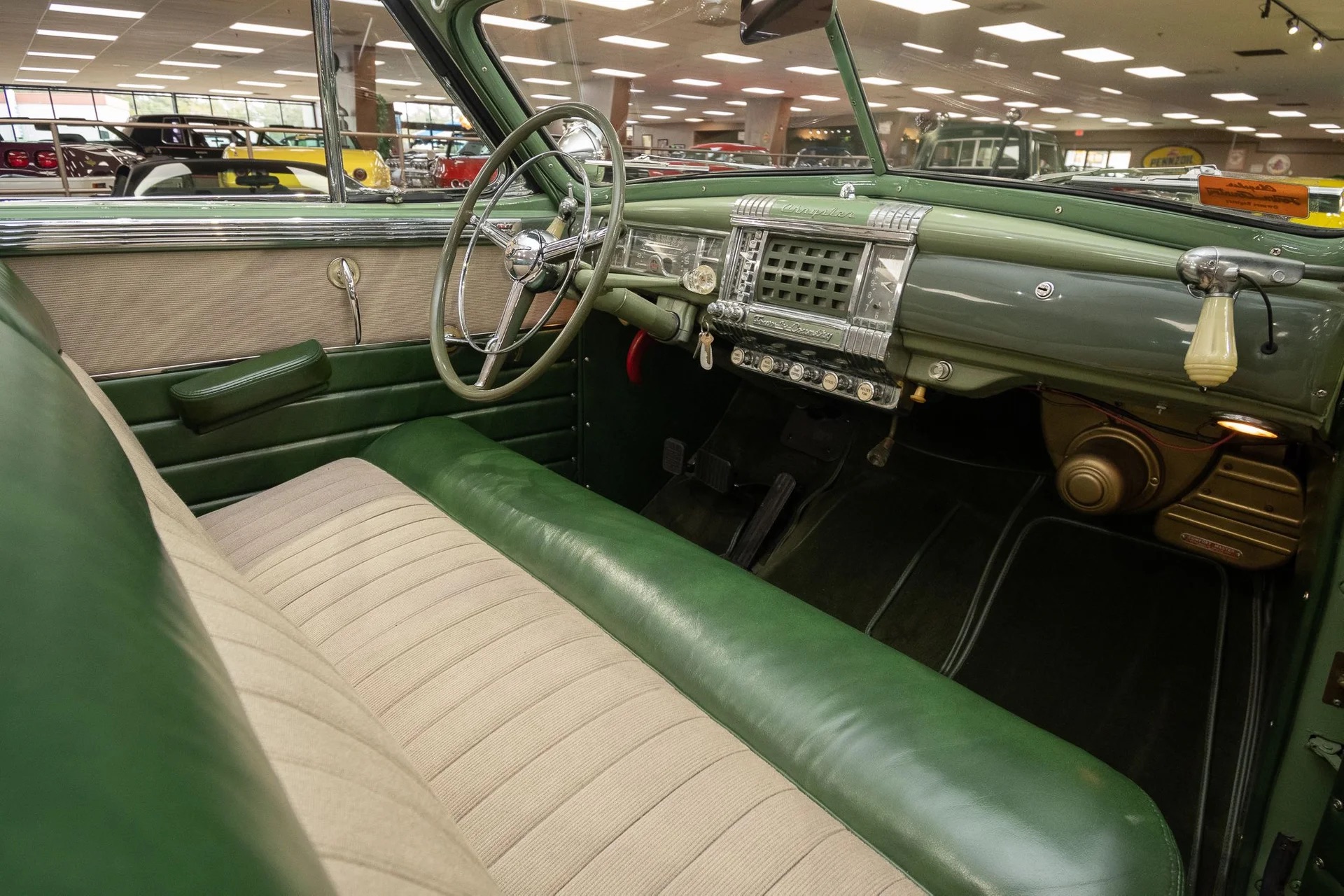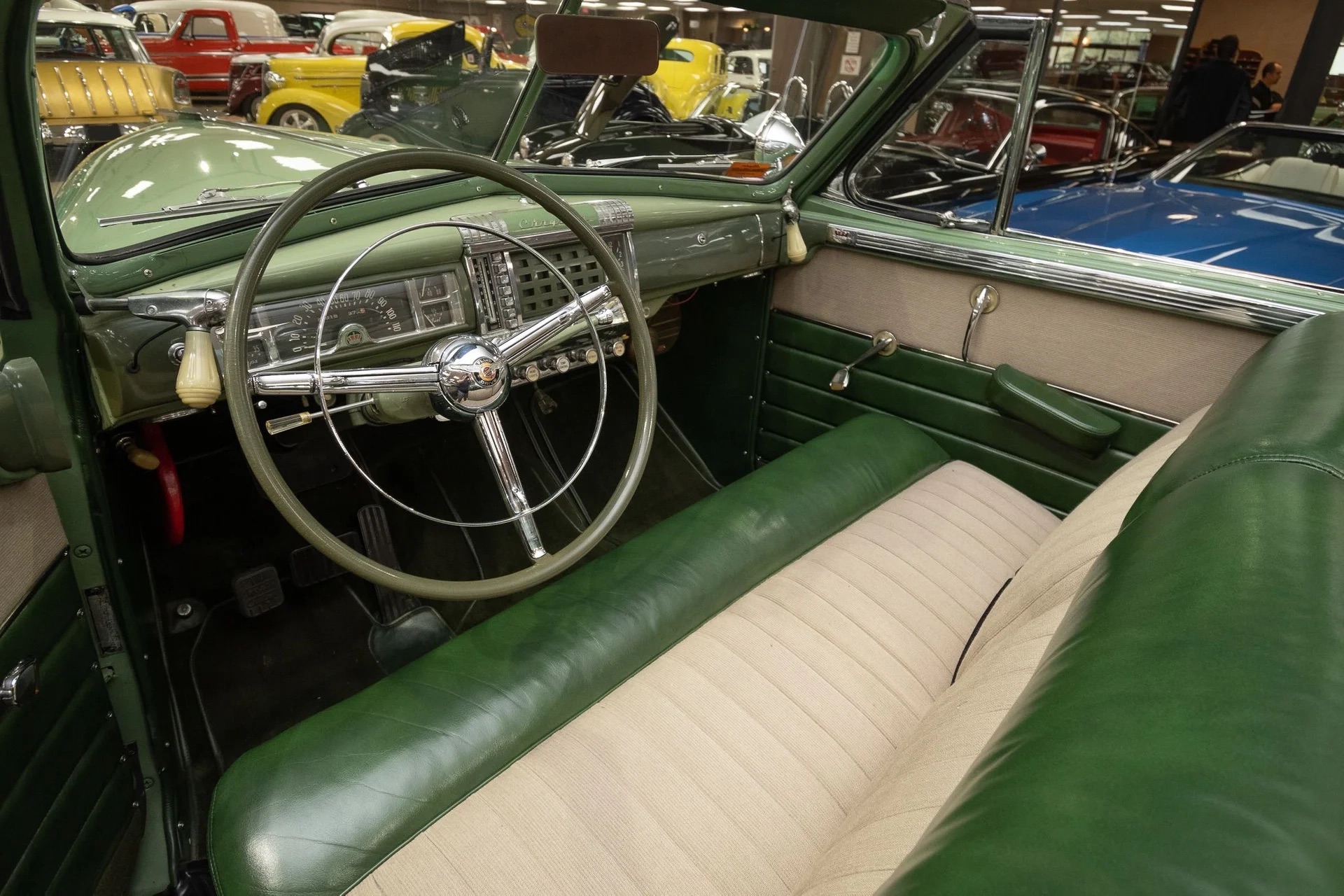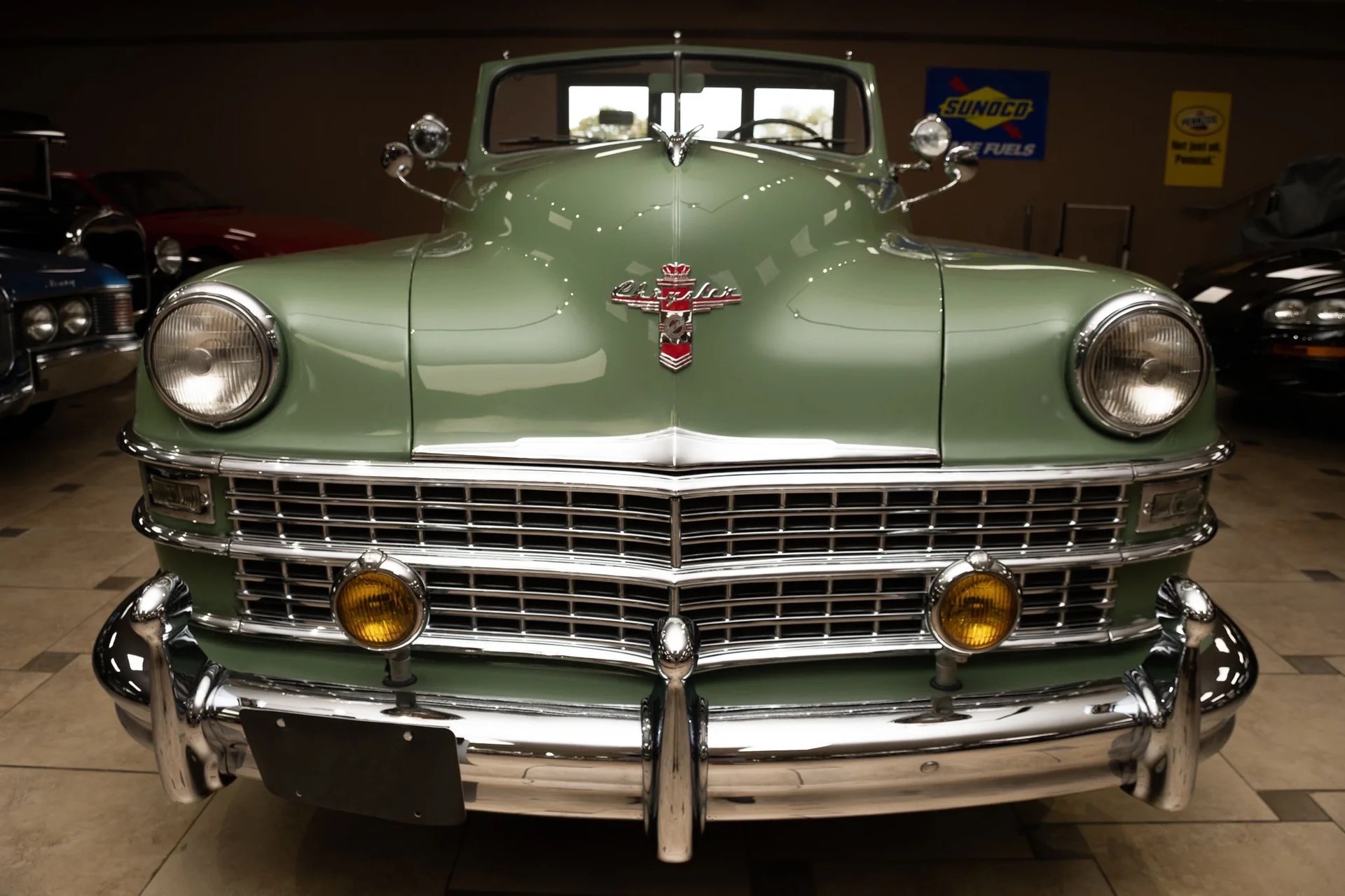 Classic beauty featuring a 323 C.I. 135hp Spitfire Straight-8 engine and 4-speed Fluid Drive transmission. Highlights include a beige power convertible top, custom wood and chrome work, dual Mopar spotlights, wide whitewall tires, and an AM radio. This timeless convertible also boasts push-button start and a carpeted trunk with spare tire. Contact us today to learn more!