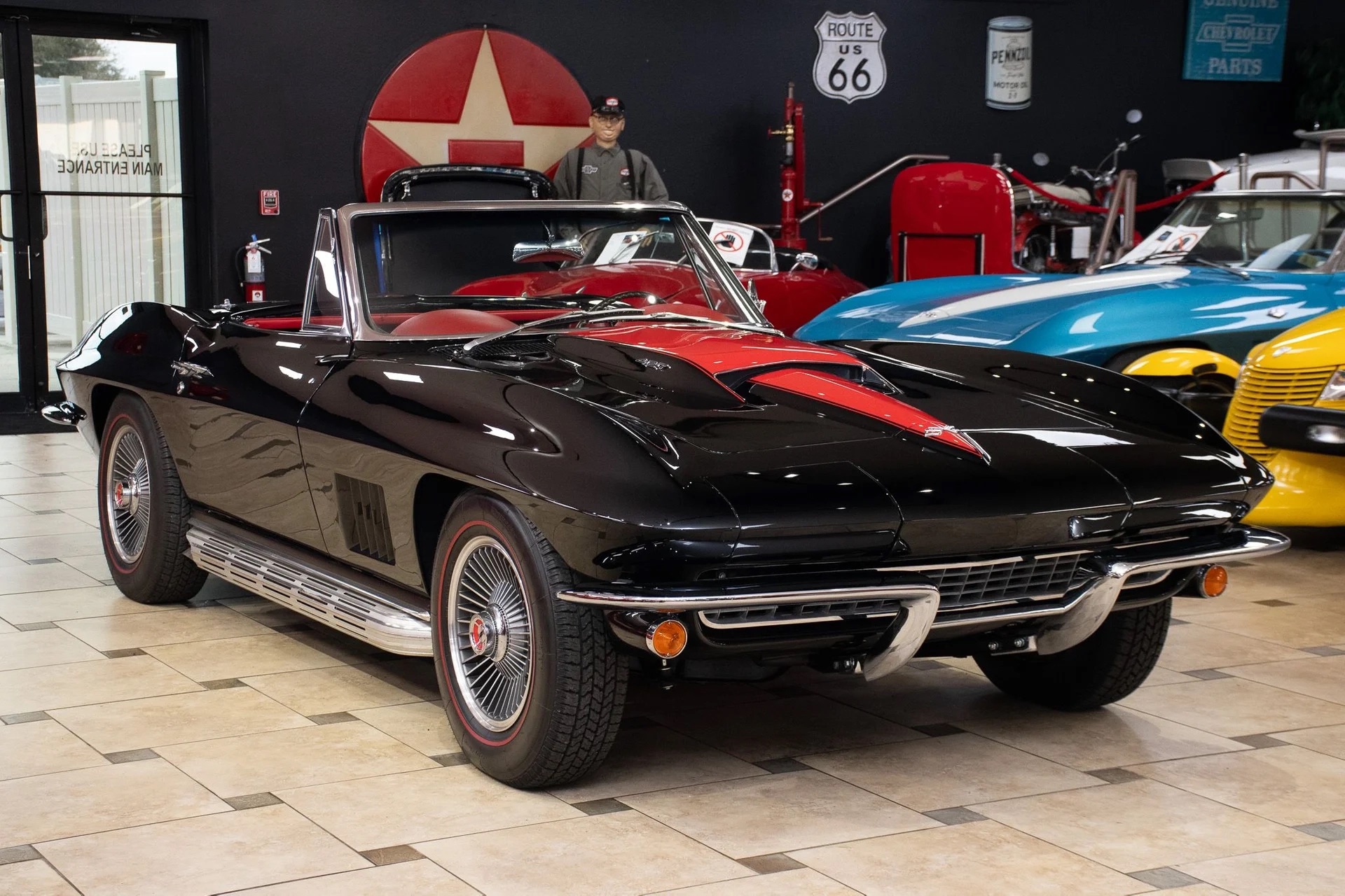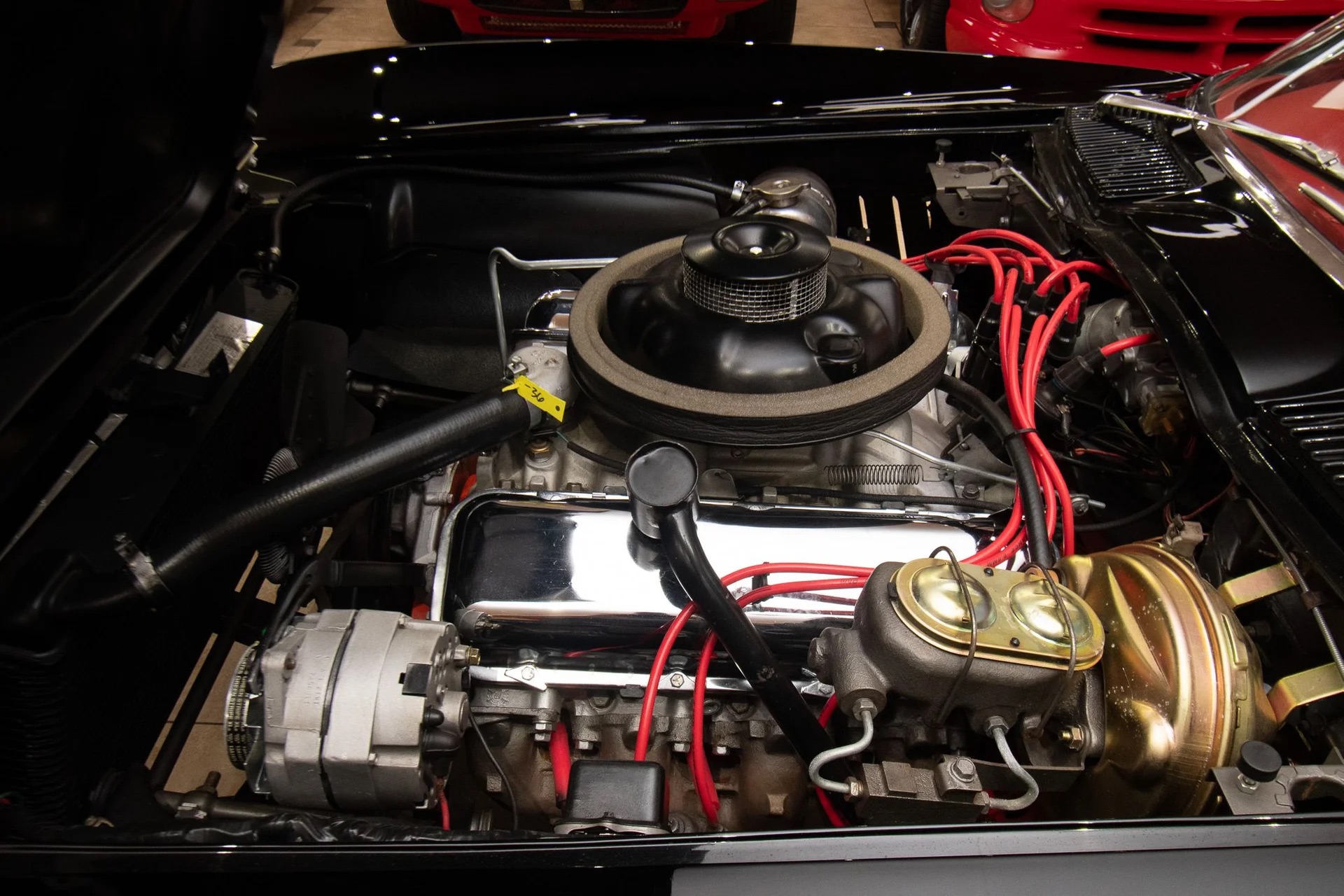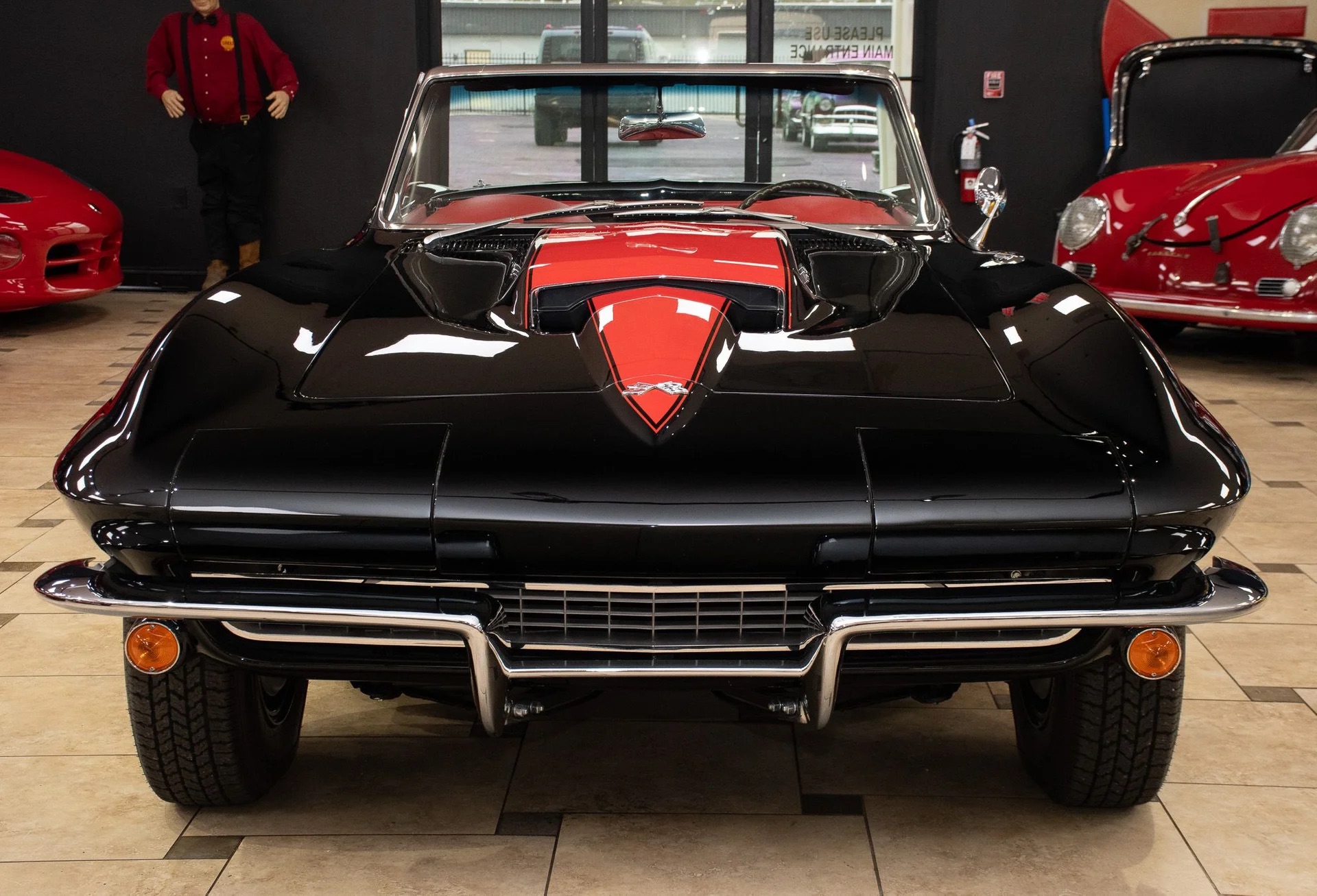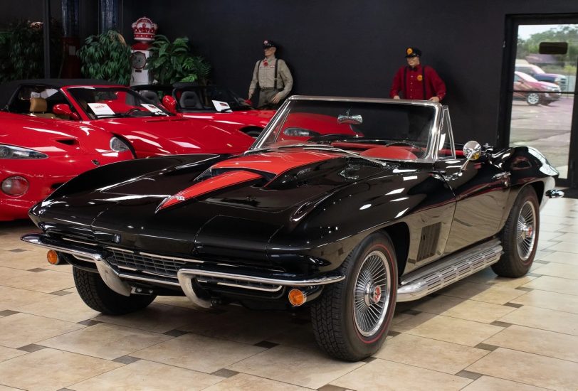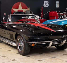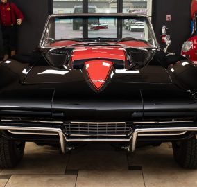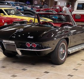 Offering a stunning 427 C.I. Big Block V8 featuring correct Winters aluminum heads and intake, L88 high-flow air cleaner, and Muncie 4-speed manual transmission. It includes side exit exhaust, 4-wheel disc brakes, power brakes, 6,500rpm redline tachometer, and 4.11 posi rear differential. Finished in Tuxedo Black with red stinger stripe, red vinyl interior, black convertible top, and shimmering chrome accents. Contact us for details!