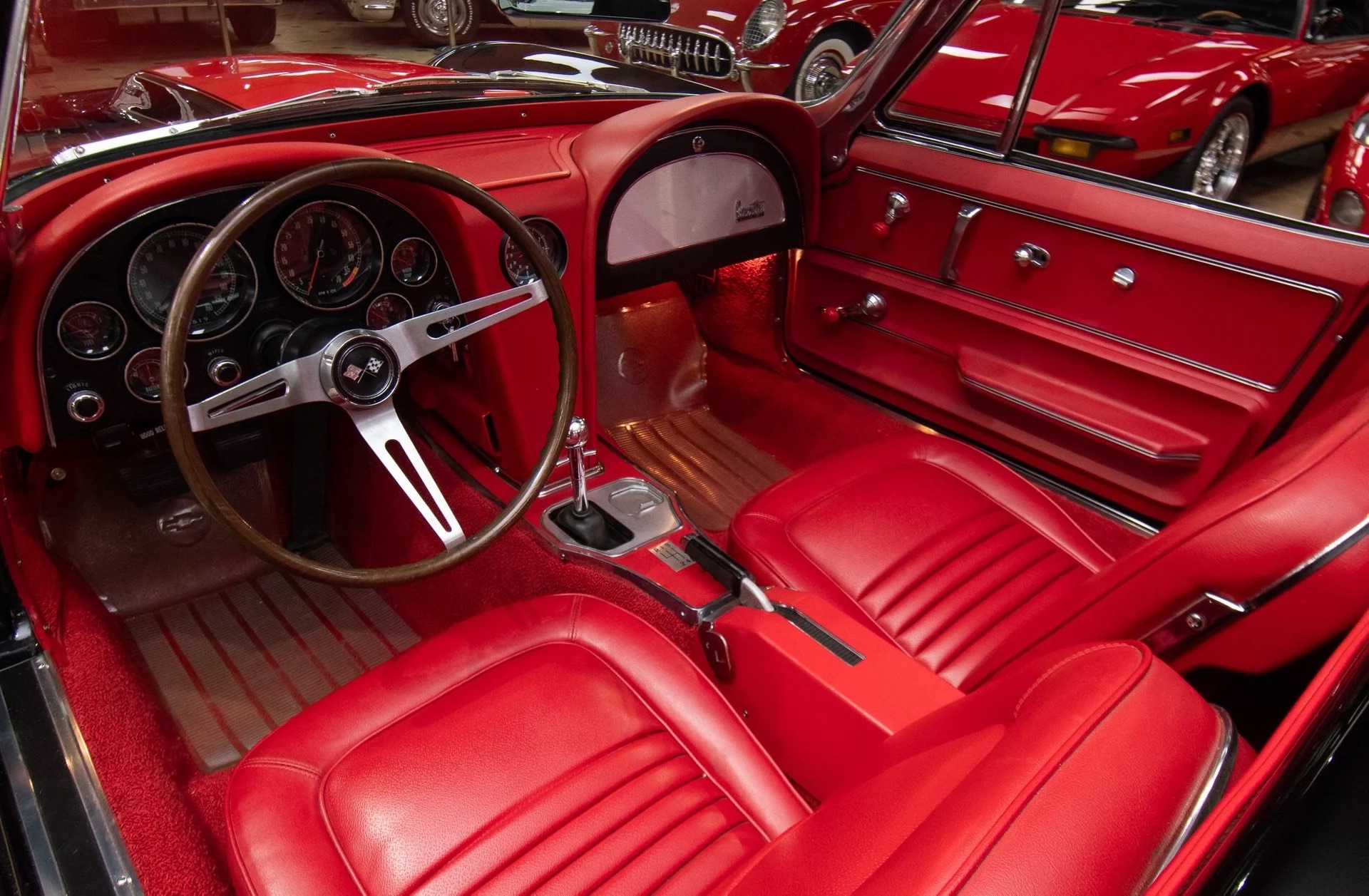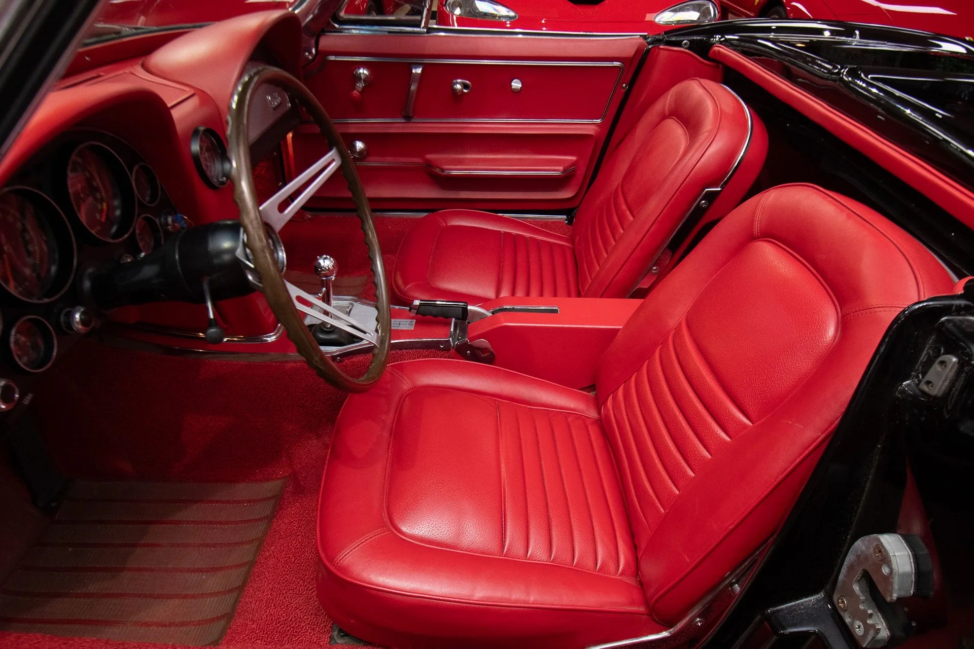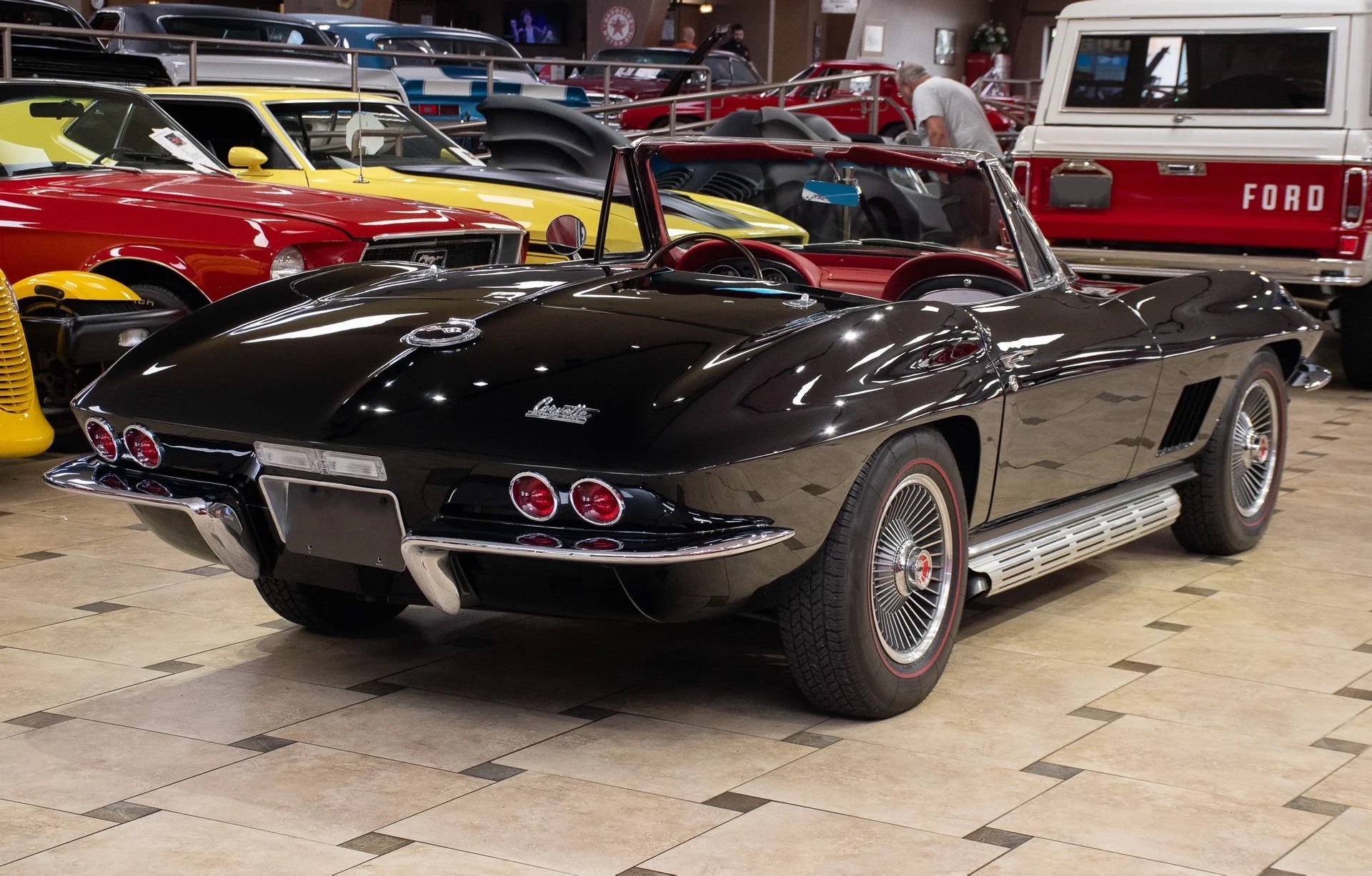Offering a stunning 427 C.I. Big Block V8 featuring correct Winters aluminum heads and intake, L88 high-flow air cleaner, and Muncie 4-speed manual transmission. It includes side exit exhaust, 4-wheel disc brakes, power brakes, 6,500rpm redline tachometer, and 4.11 posi rear differential. Finished in Tuxedo Black with red stinger stripe, red vinyl interior, black convertible top, and shimmering chrome accents. Contact us for details!