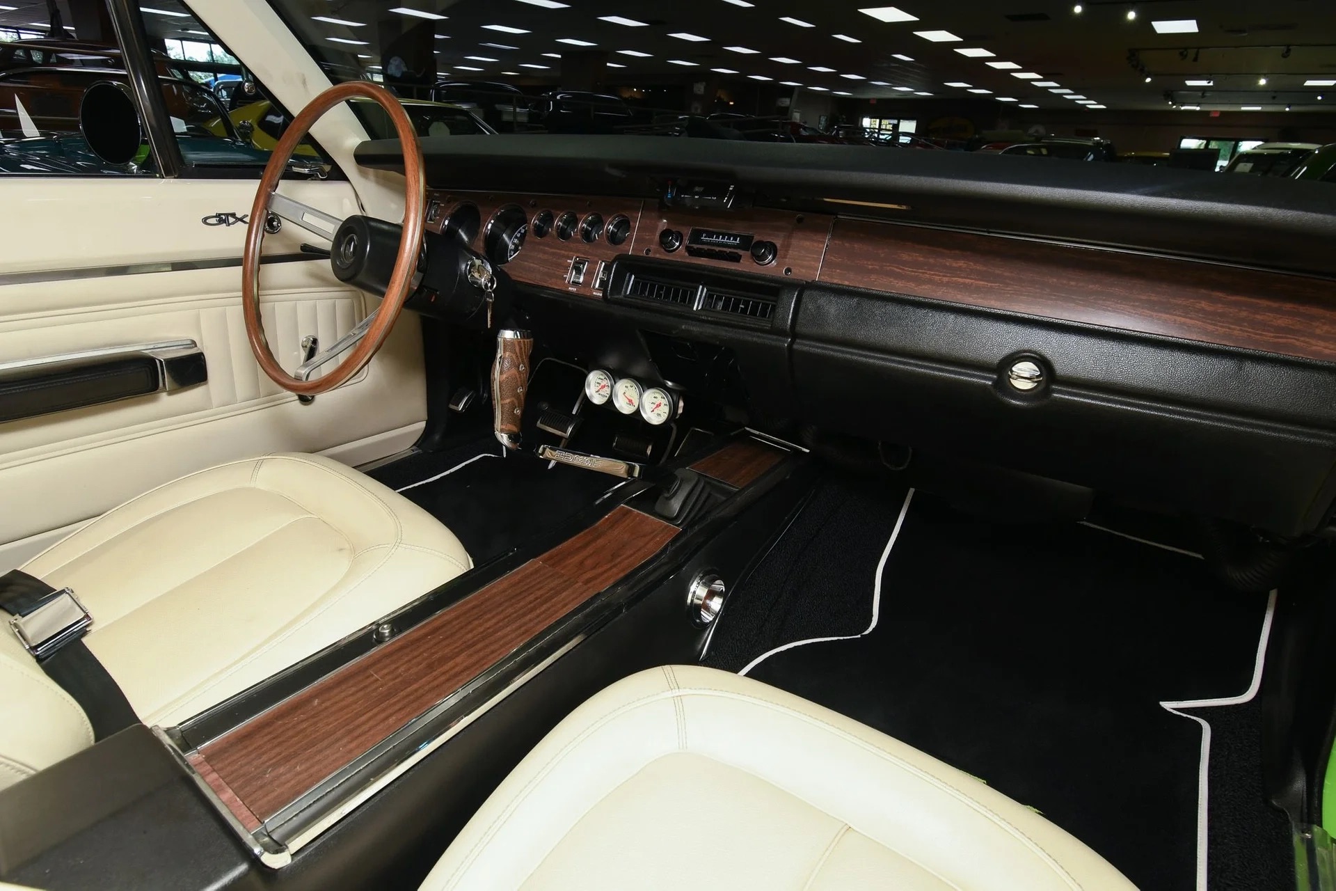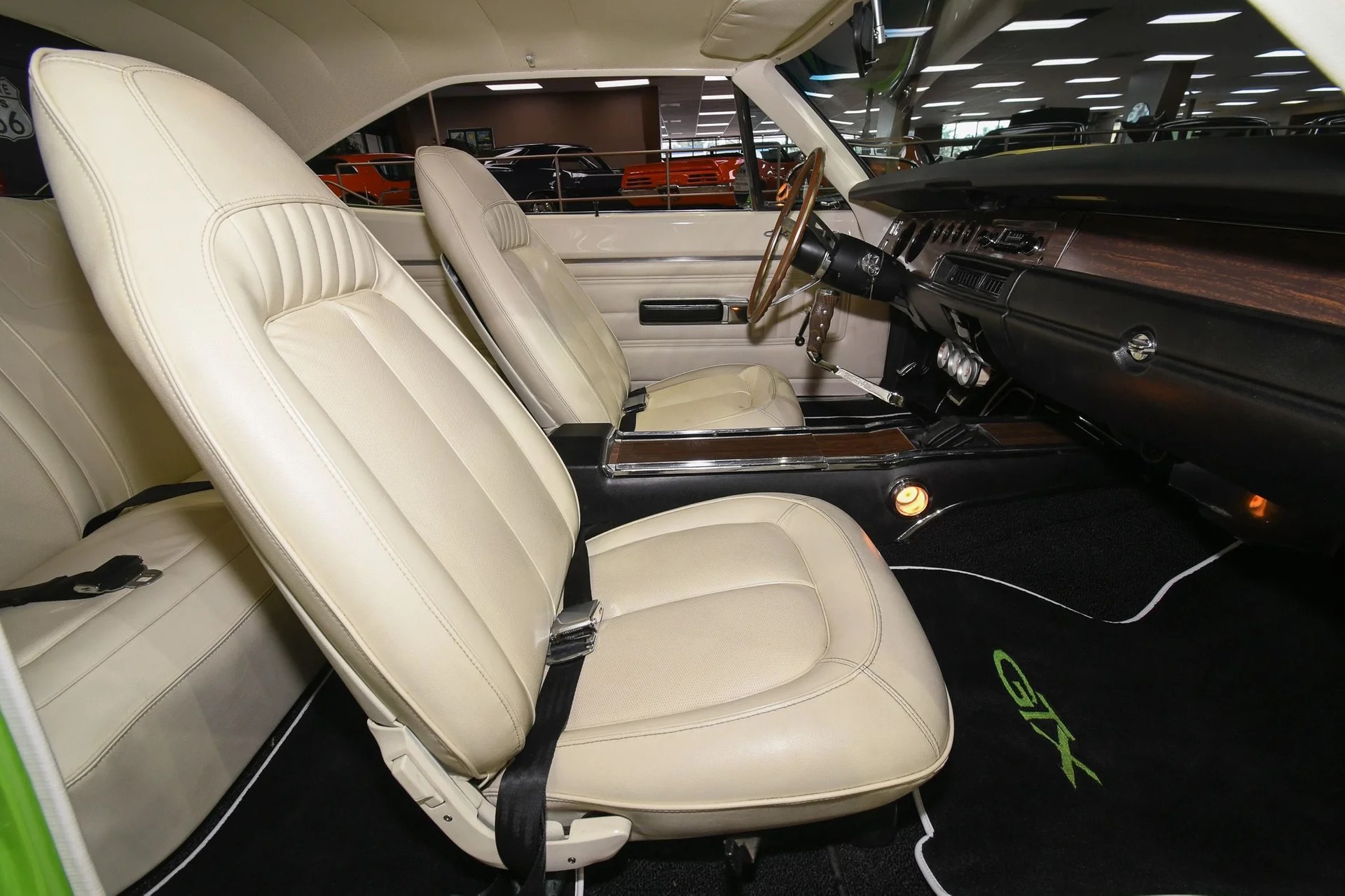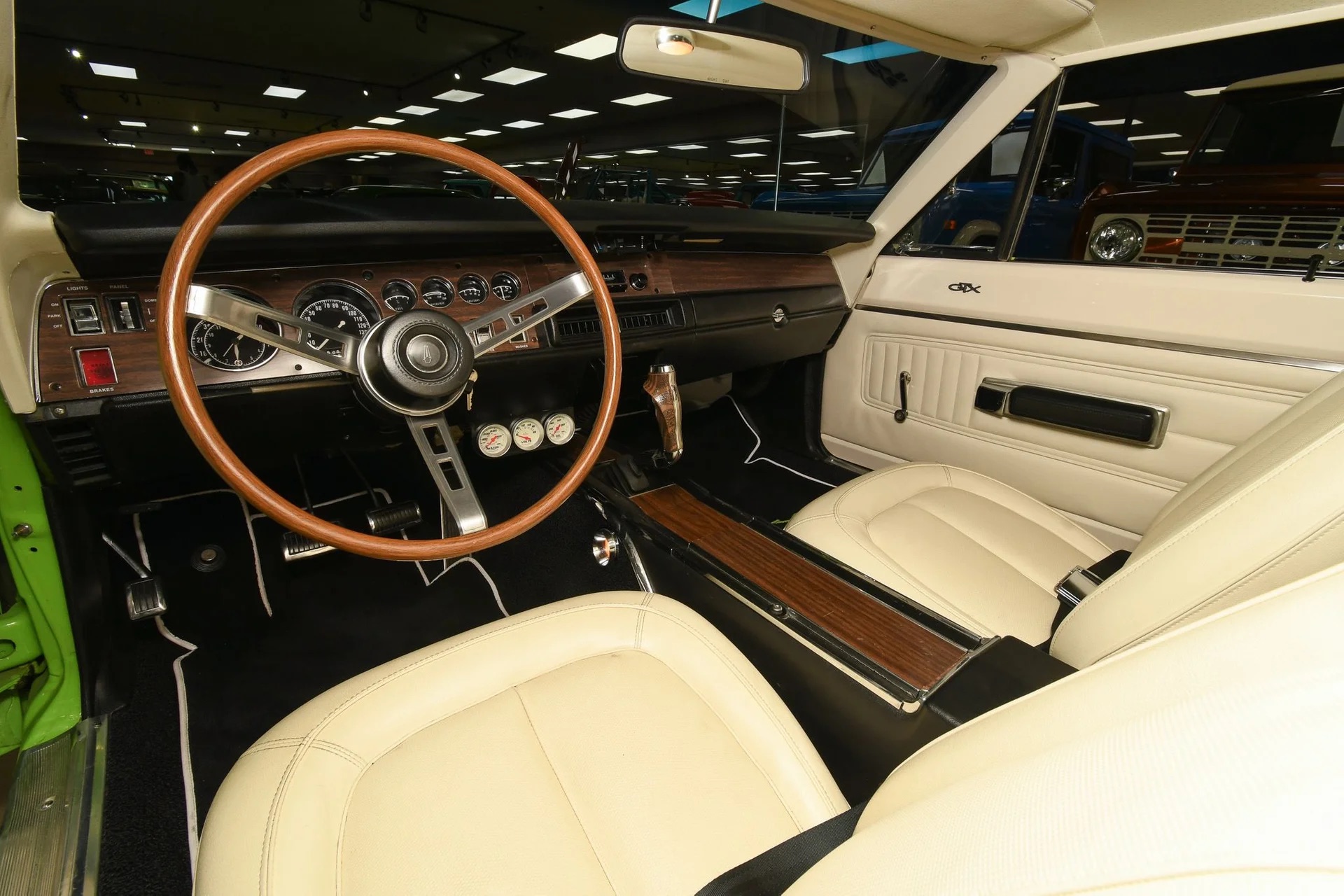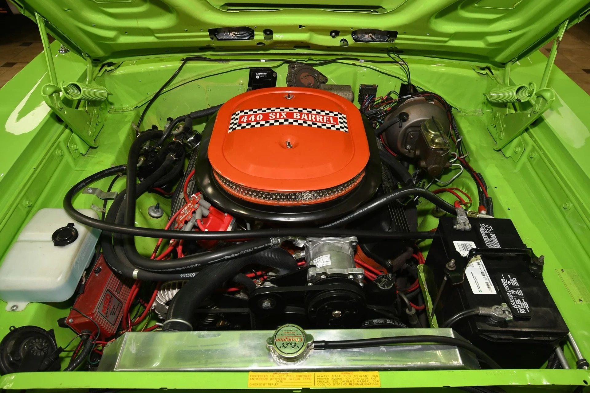 Offering a powerful Big Block 440 C.I. 6-barrel V8 muscle car with heavy-duty 4-speed manual transmission and Hurst pistol grip shifter. Features include power steering and brakes, upgraded aluminum radiator with dual electric fans, modern A/C, wood-rim steering wheel, Mopar performance valve covers, white vinyl interior with front bucket seats and center console, and classic painted steel wheels with "dog dish" hubcaps. Finished in striking FJ5 Limelight. Contact us for details!