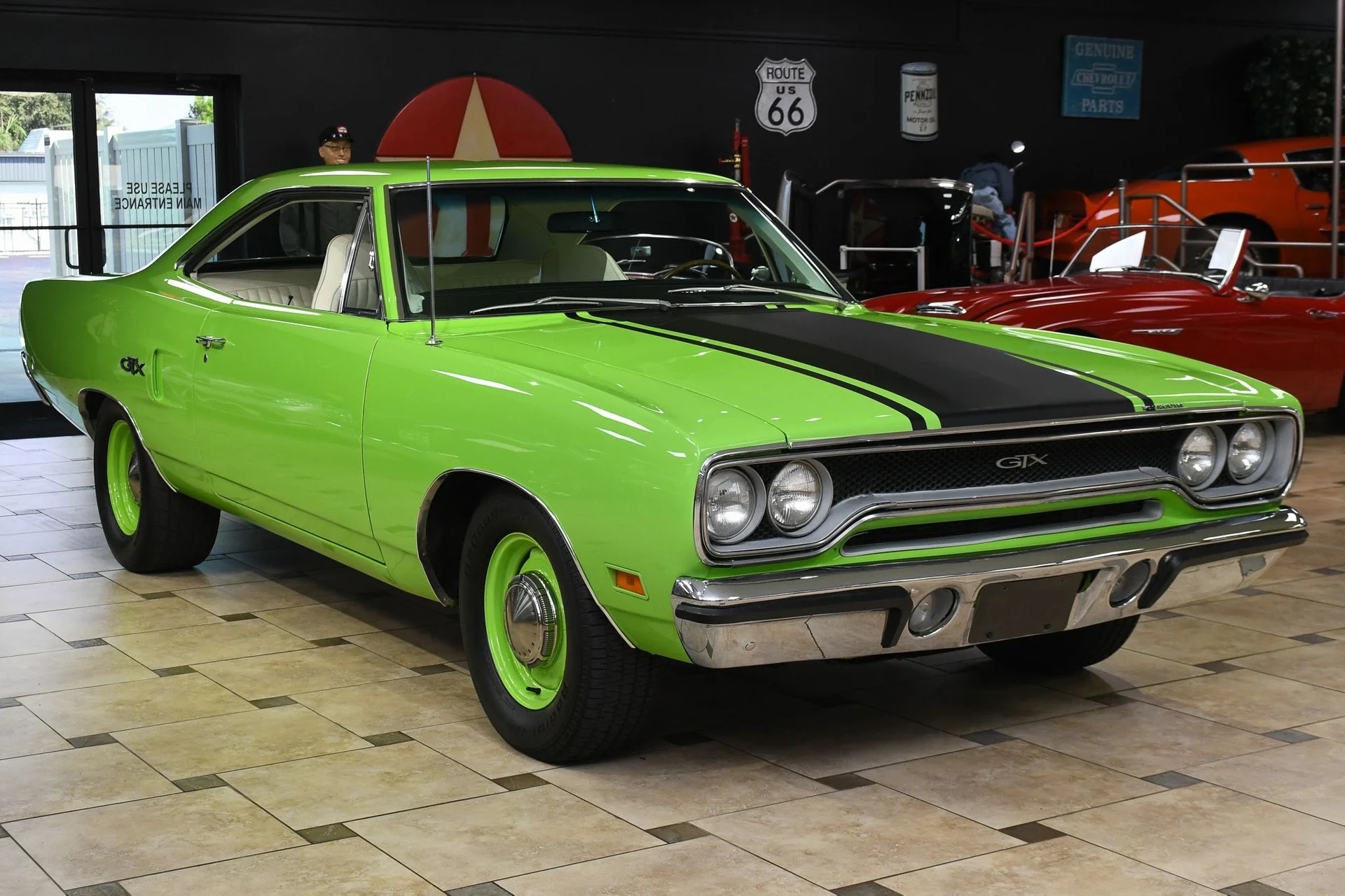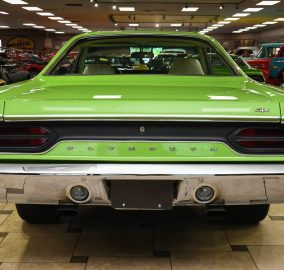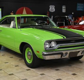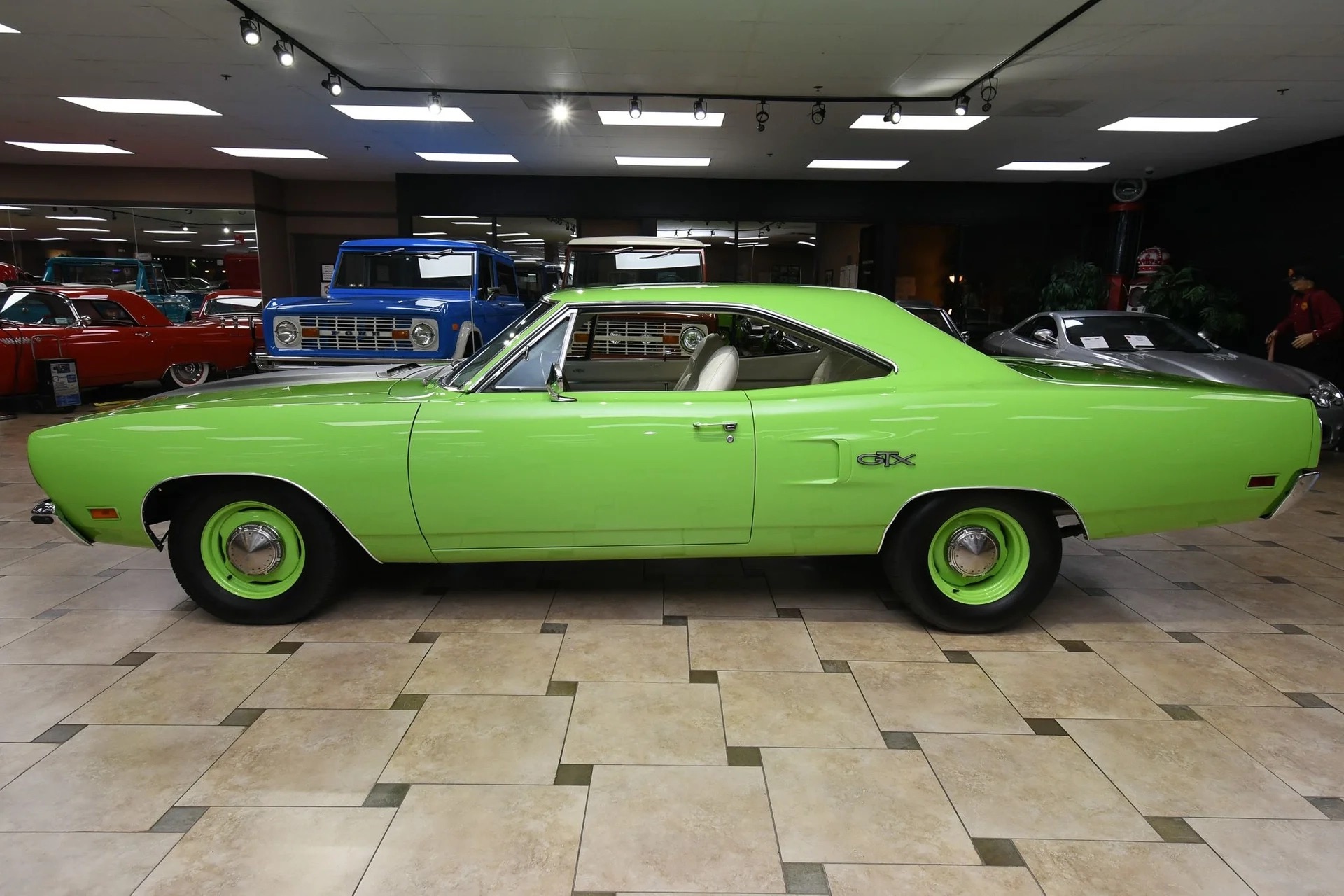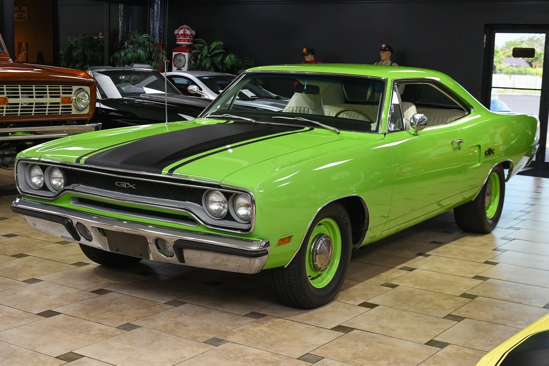 Offering a powerful Big Block 440 C.I. 6-barrel V8 muscle car with heavy-duty 4-speed manual transmission and Hurst pistol grip shifter. Features include power steering and brakes, upgraded aluminum radiator with dual electric fans, modern A/C, wood-rim steering wheel, Mopar performance valve covers, white vinyl interior with front bucket seats and center console, and classic painted steel wheels with "dog dish" hubcaps. Finished in striking FJ5 Limelight. Contact us for details!