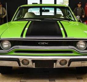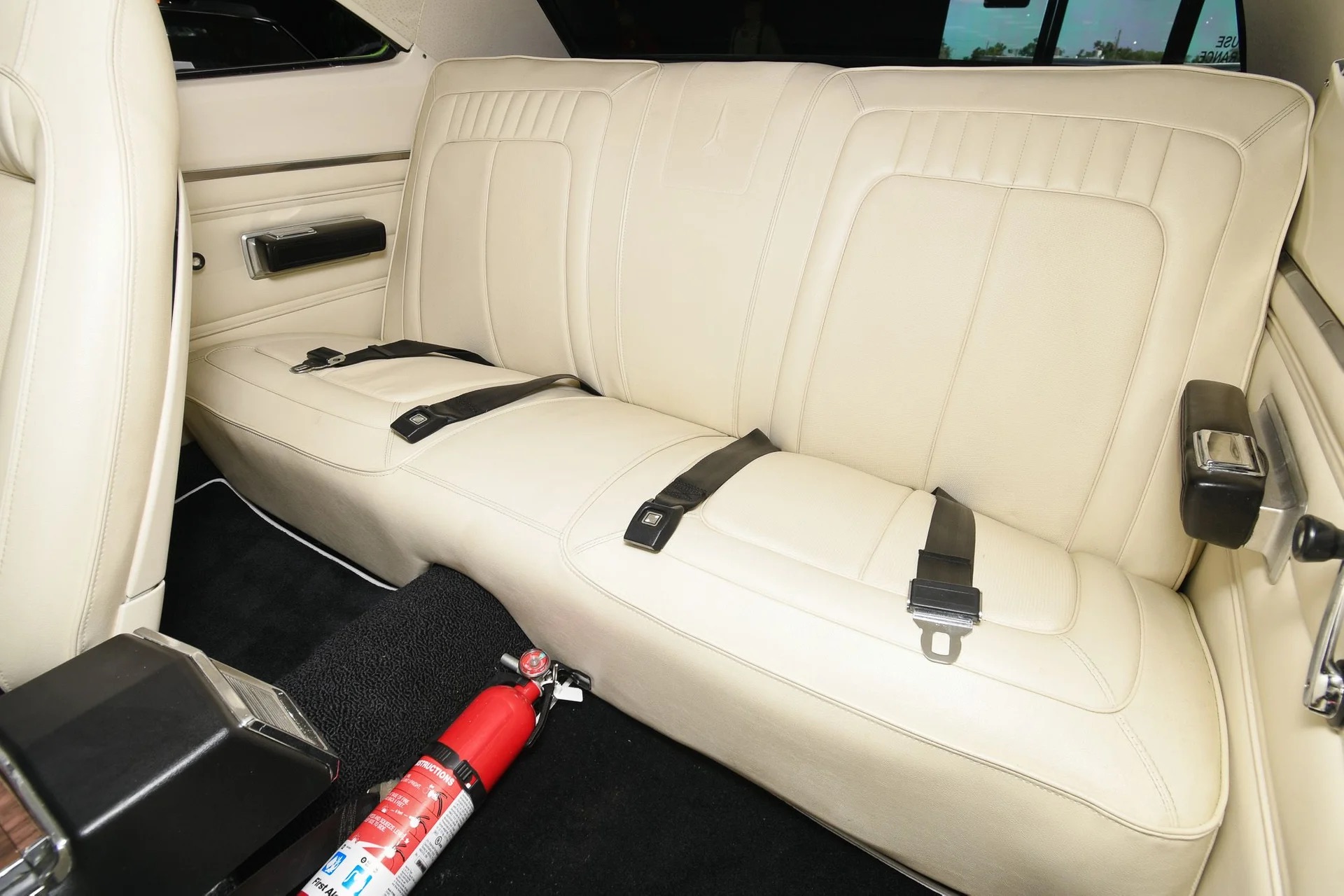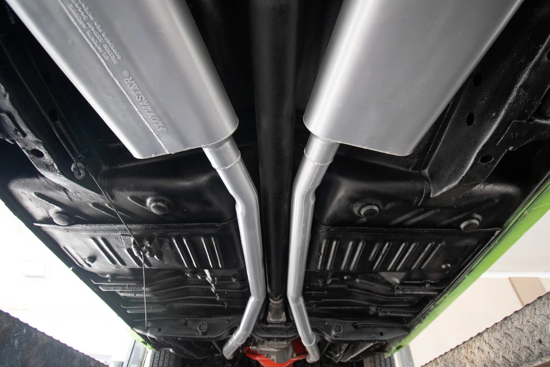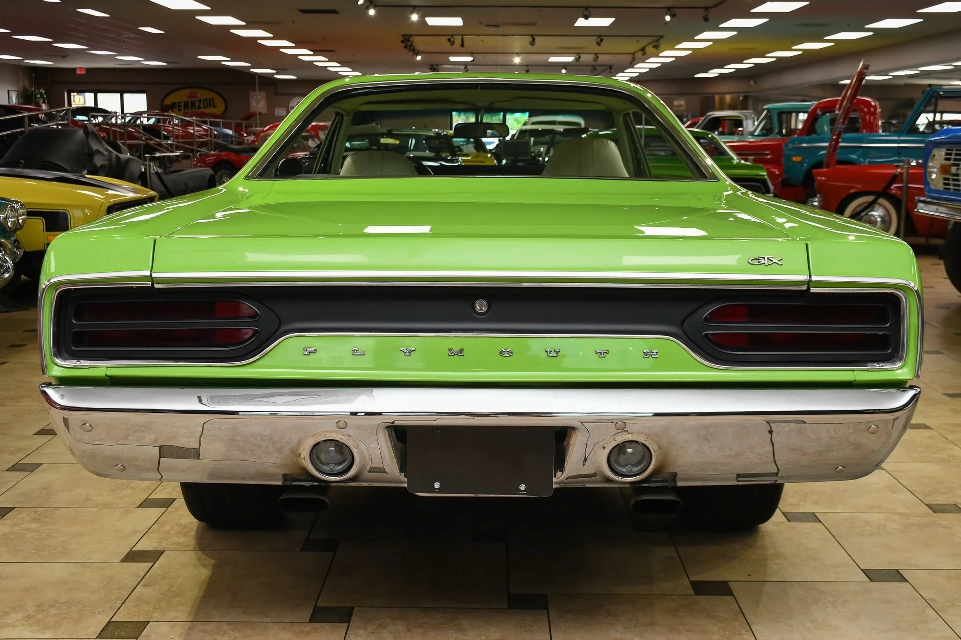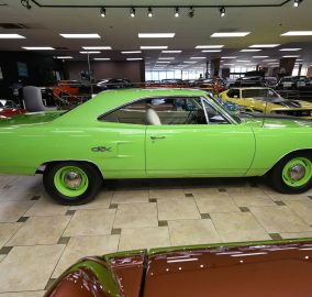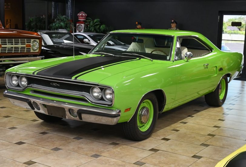 Offering a powerful Big Block 440 C.I. 6-barrel V8 muscle car with heavy-duty 4-speed manual transmission and Hurst pistol grip shifter. Features include power steering and brakes, upgraded aluminum radiator with dual electric fans, modern A/C, wood-rim steering wheel, Mopar performance valve covers, white vinyl interior with front bucket seats and center console, and classic painted steel wheels with "dog dish" hubcaps. Finished in striking FJ5 Limelight. Contact us for details!
