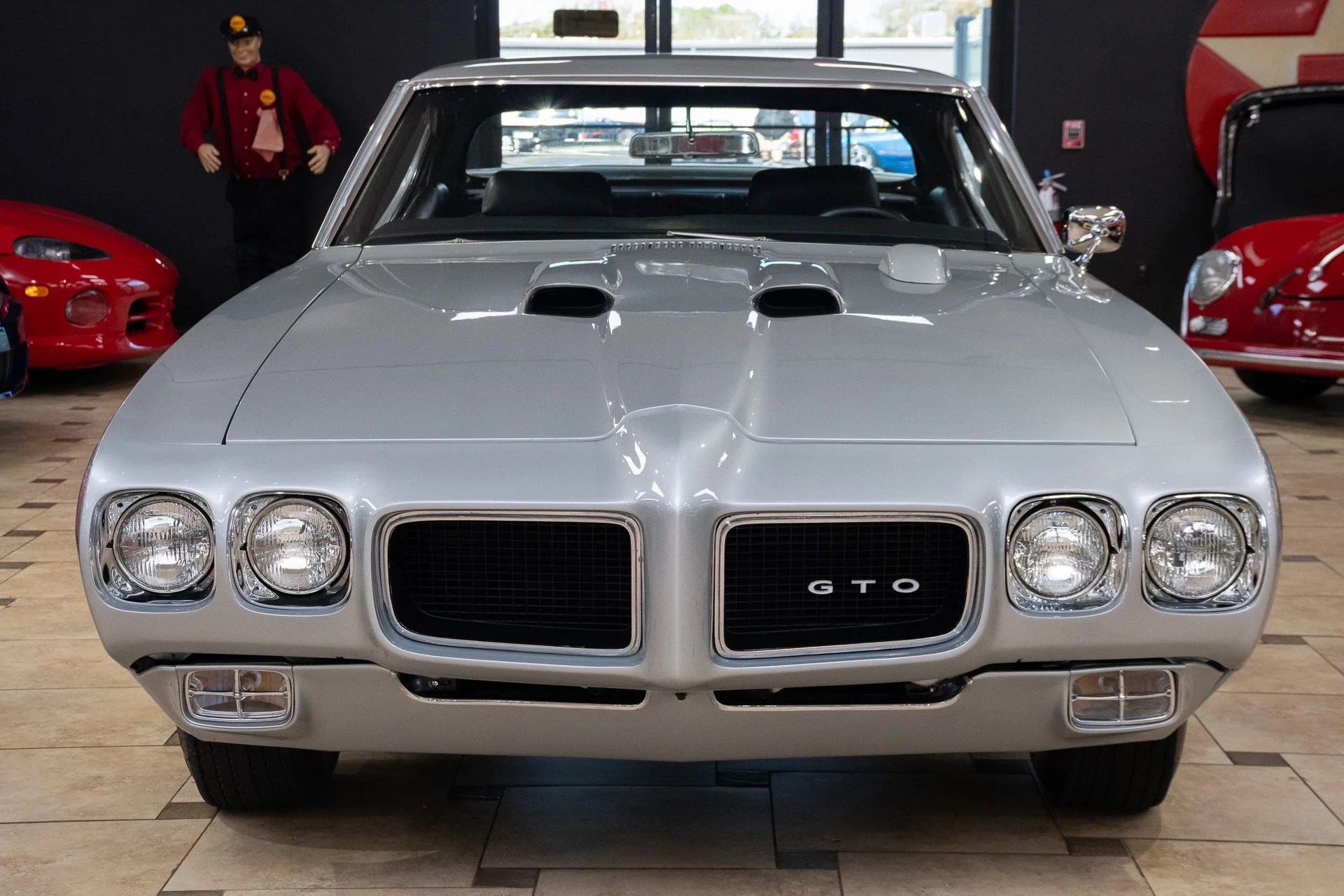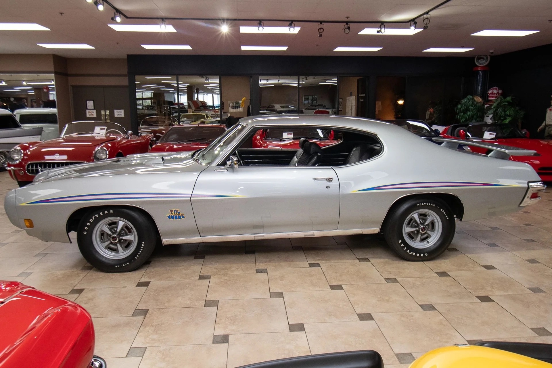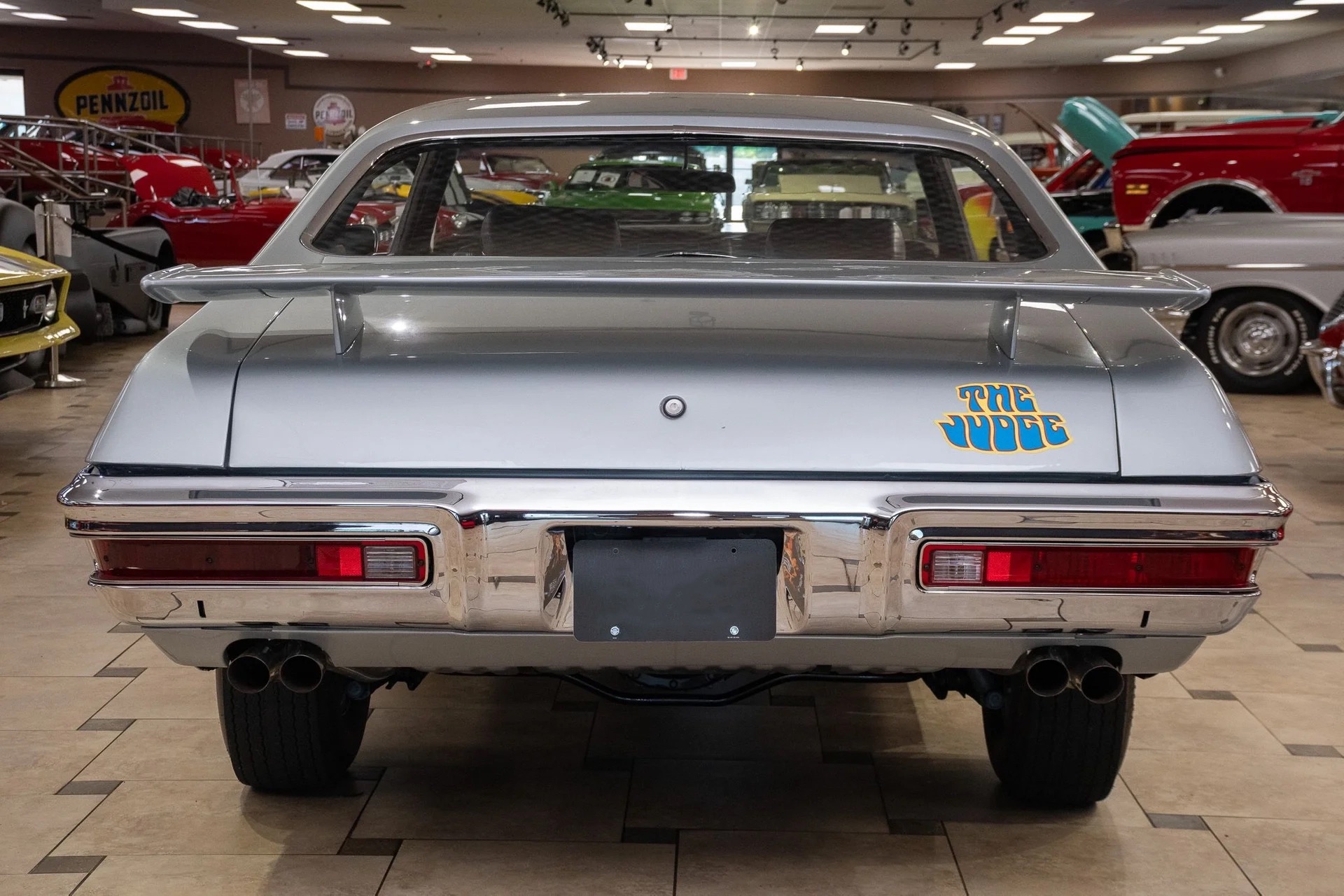 Offering a beautifully restored 'The Judge' featuring a 366hp 400 C.I. V8 with Ram Air III induction and Turbo-Hydramatic 400 transmission. It includes power steering and brakes, front disc brakes, hood tachometer, Formula steering wheel, PMD Rally II wheels with Goodyear Polyglas tires, rear spoiler, and black vinyl interior with bucket seats and center console. Finished in Palladium Silver with authentic multicolor graphics. Contact us today!